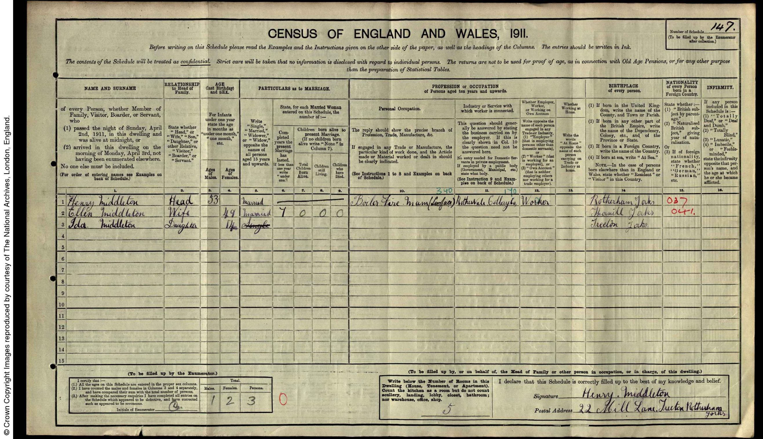 • Lived at: 22 Mill Lane Treeton, 1911, Rotherham Yorkshire England.