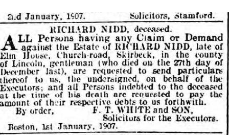 • Lived at: 25 Spilsby, 1901, Skirbeck, Lincolnshire, England. 4 5 • Occupation: retired farmer, 31 Mar 1901, Skirbeck, Lincolnshire, England. 4 5 • ADDRESS: Elm House, 1906, Church Road, Skirbeck, Lincolnshire. • Probate: effects 810 pounds 3s, 2 May 1907, London. note: in the probate records it says he died in 1886, which is not true Richard married Mary Harriet Pick, daughter of Mary, in Dec 1858 in Boston, Lincolnshire, England.1 (Mary Harriet Pick was born in 1840 in Fosdyke, Lincolnshire, England,8 died on 6 Nov 1900 in Boston, Lincolnshire, England 17 18 and was buried on 9 Nov 1900 in Skirbeck, Lincolnshire, England 19.) Richard next married Emma Temple, daughter of John Temple and Ann Bosnell, Sep Q 1904 in Nottingham, Nottingham, England.2 3 (Emma Temple was born on 30 Jun 1850 in Algarkirk, Lincolnshire, England 20 21 22, baptized on 4 Aug 1850 in Algarkirk, Lincolnshire, England and died Sep Q 1926 in Nottingham, Nottingham, England 17 20.). The cause of her death was Senile Dementia. |