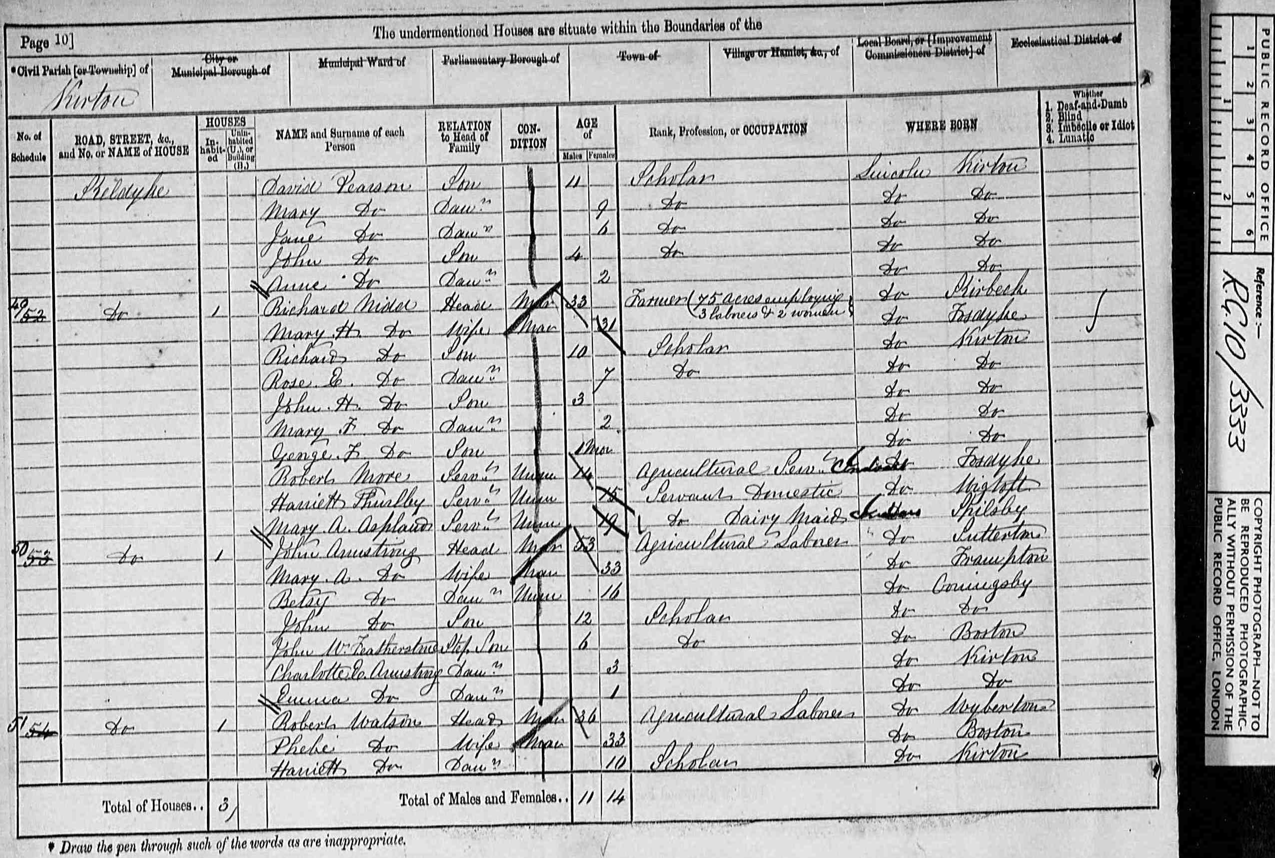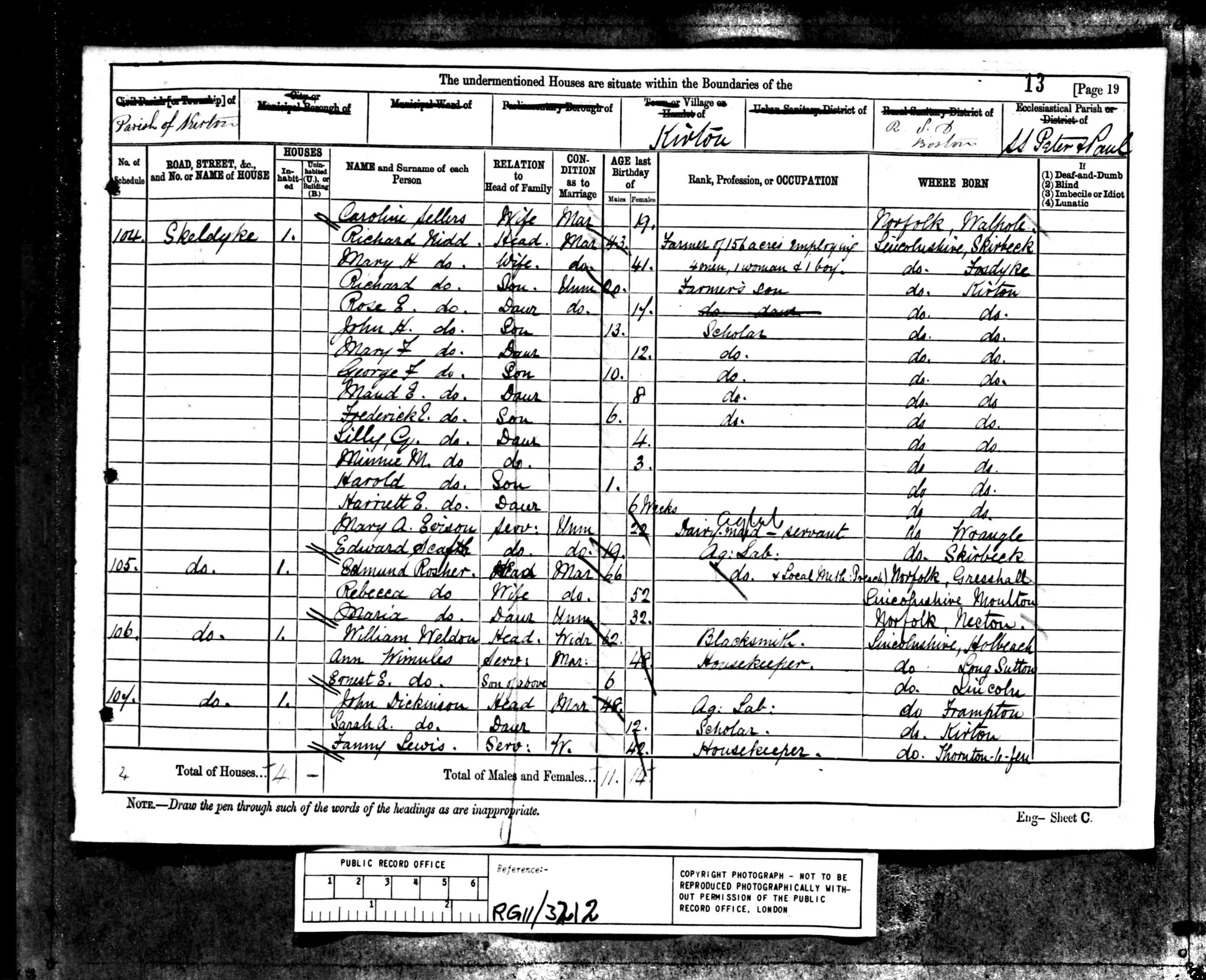• Lived at: Skeldyke, 1871, Kirton, Lincolnshire, England. 5 12 • Occupation: Farmer 75 acres employing 3 labourers and 2 women, 1871, Skeldyke, Kirton, Boston, Lincolnshire, England. 5 • Occupation: farming 102 acres rental income 196 pounds annum, 1873, Kirton, Lincolnshire, England.