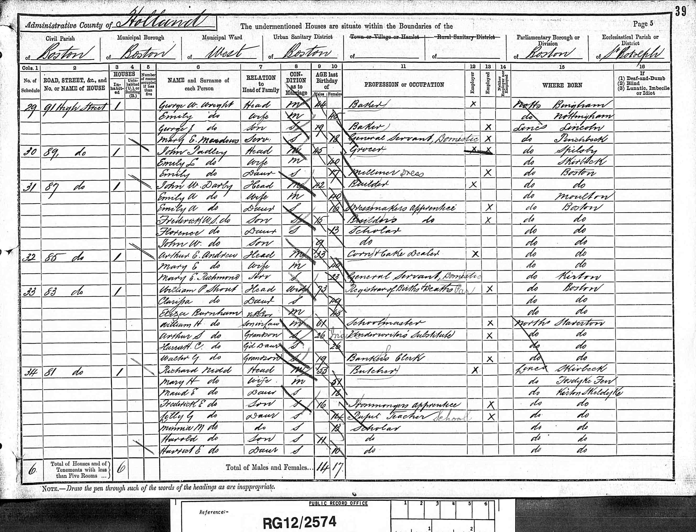 • Lived at: 81 High Street, 1891, Boston, Lincolnshire, England. 5 • Occupation: Butcher, 1891, Boston, Lincolnshire, England. 5