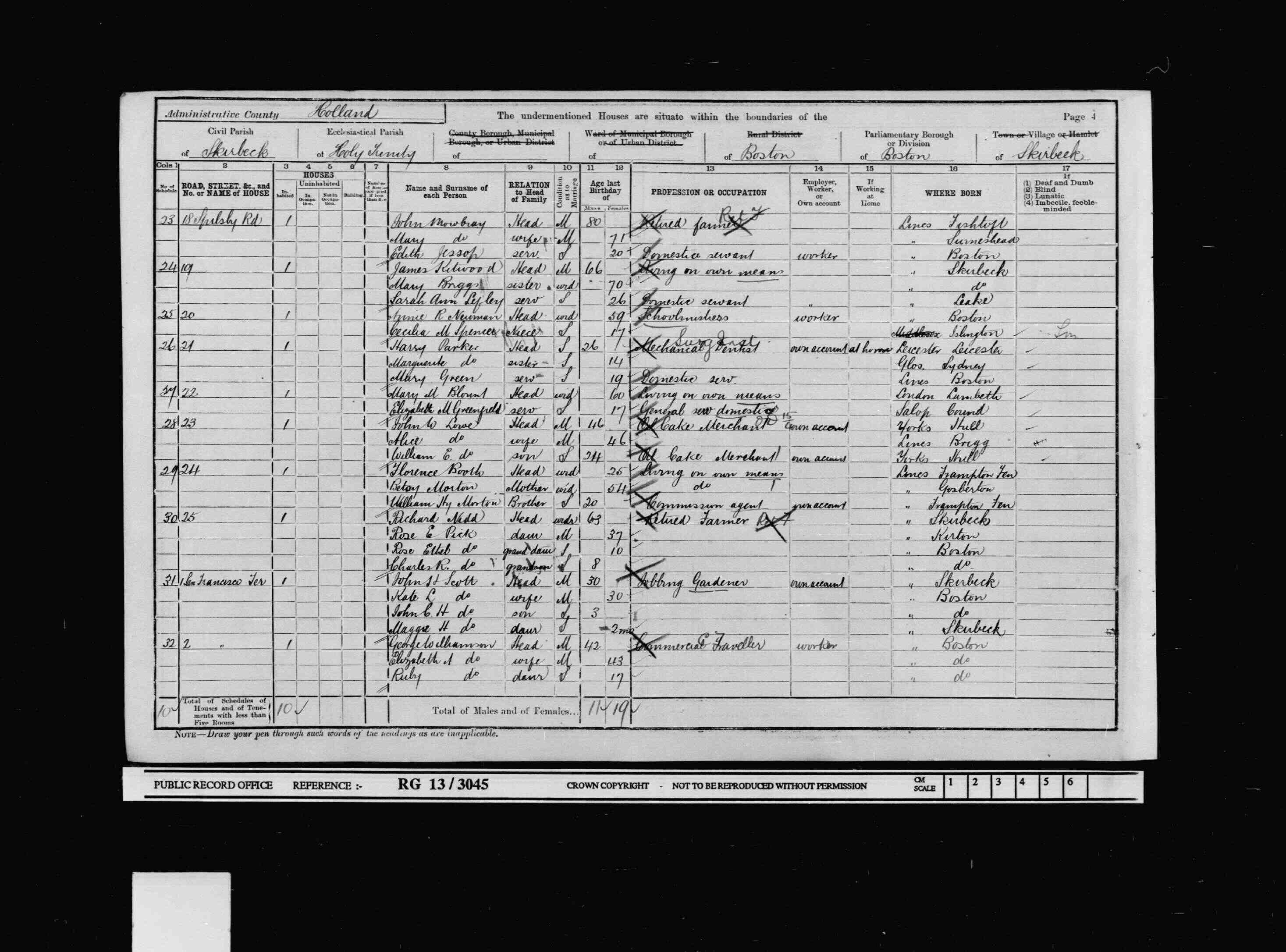 4 (1901 English and Welsh Census(London, TNA/Ancestry.co.uk, 2002) , Web site showing copies of original enumerator schedules) ID: CEN 1901, RG13/3045 Skirbeck Holy Trinity Boston Skirbeck. Cit. Date: 16 Feb 2004. Cit. ID: CEN 1901 RG13/3045. Surety: 3.