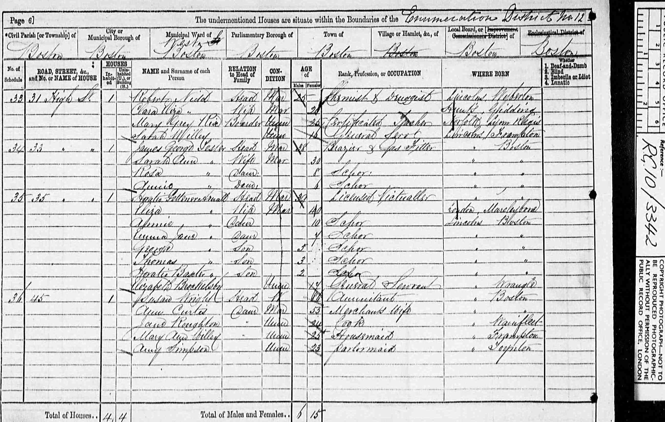 • Occupation: CHemist and Druggist, 1871, Boston, Lincolnshire, England. 9 • Occupation: Mineral Water Manufacturer, 1876, Boston, Lincolnshire, England.