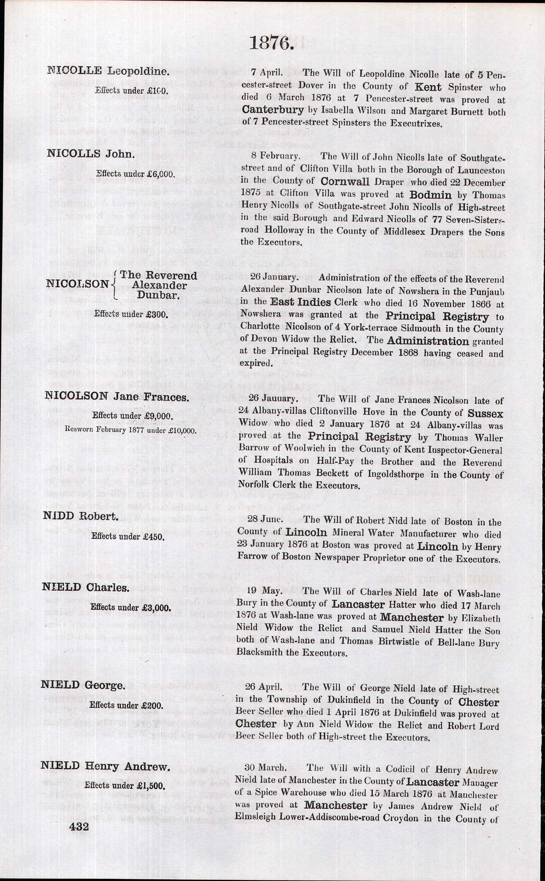Findmypast.com, England & Wales, National Probate Calendar (Index of Wills and Administrations),1861-1941. Surety: 3. Nidd, Robert 28 june 1876 Effects under 450 pounds