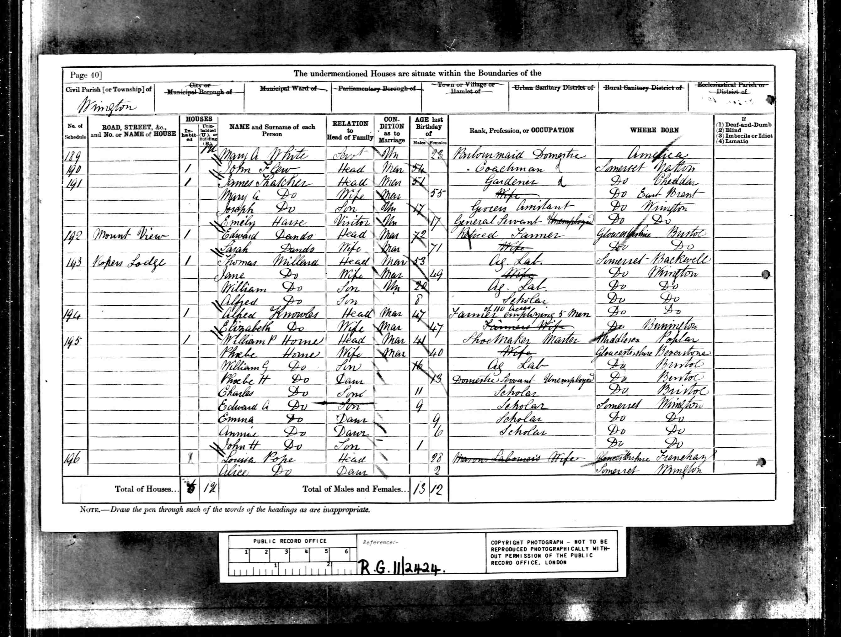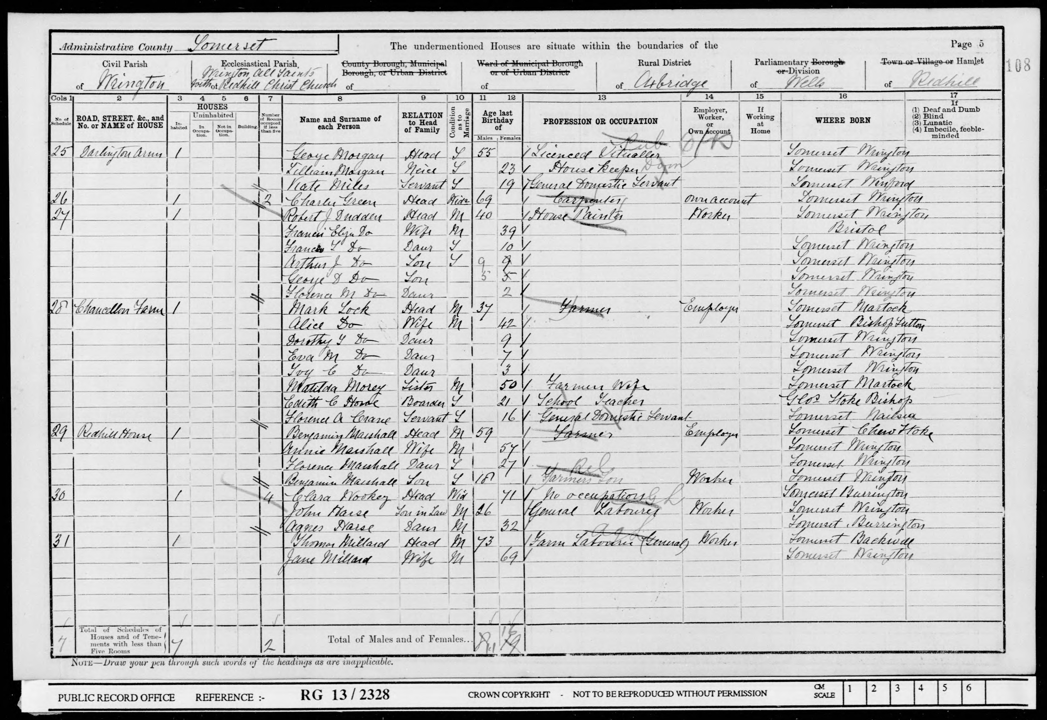 • Occupation: Ag Lab, 1871, Wrington, Somerset, England. 4 • Lived at: Ropers Lodge, 1881, Wrington, Somerset, England. 5