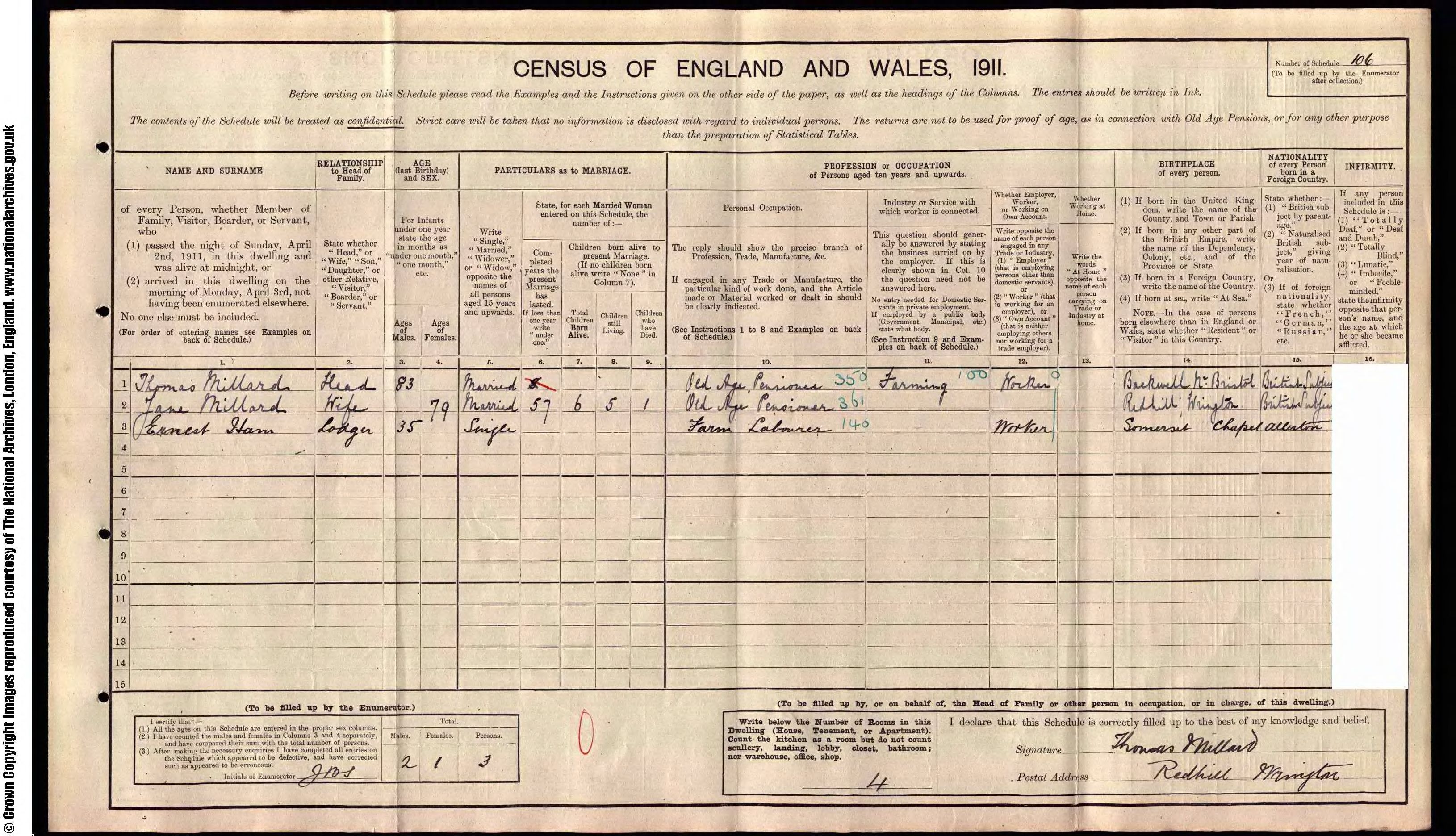 • Lived at: Red Hill, 1911, Wrington, Somerset, England. • Pension: Old Age Pension, 1911, Redhill, Wrington. Thomas married Jane Batt on 18 Jun 1854 in Bedminster, Somerset, England. (Jane Batt was born circa 1832 in Wrington, Somerset, England 5 and died after 1911 5.) |