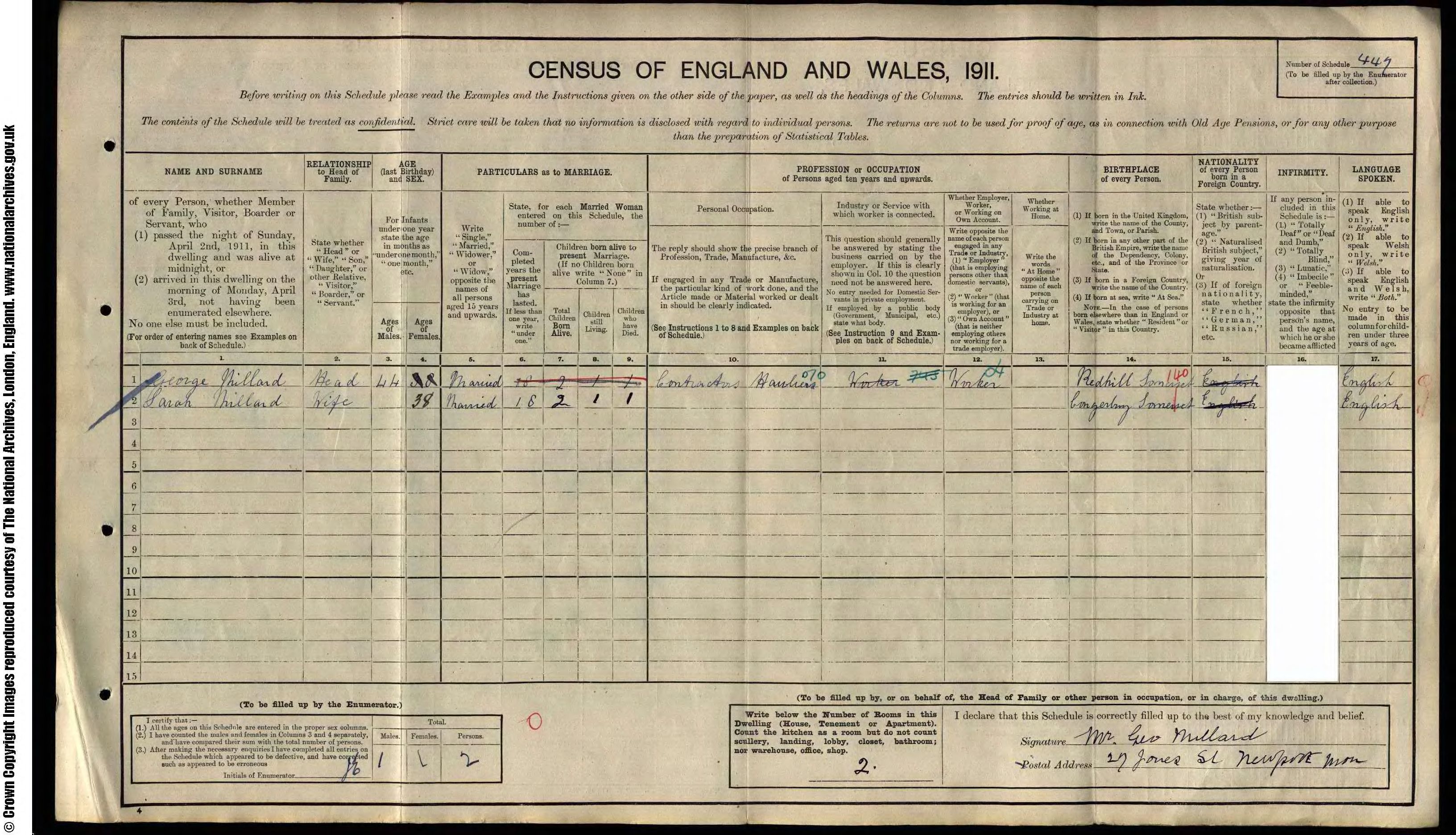 • Lived at: 27 Jones Street, 1911, Newport, Monmouth. George married Sarah circa 1893. (Sarah was born circa 1873 in Congresbury and died after 1911.) |