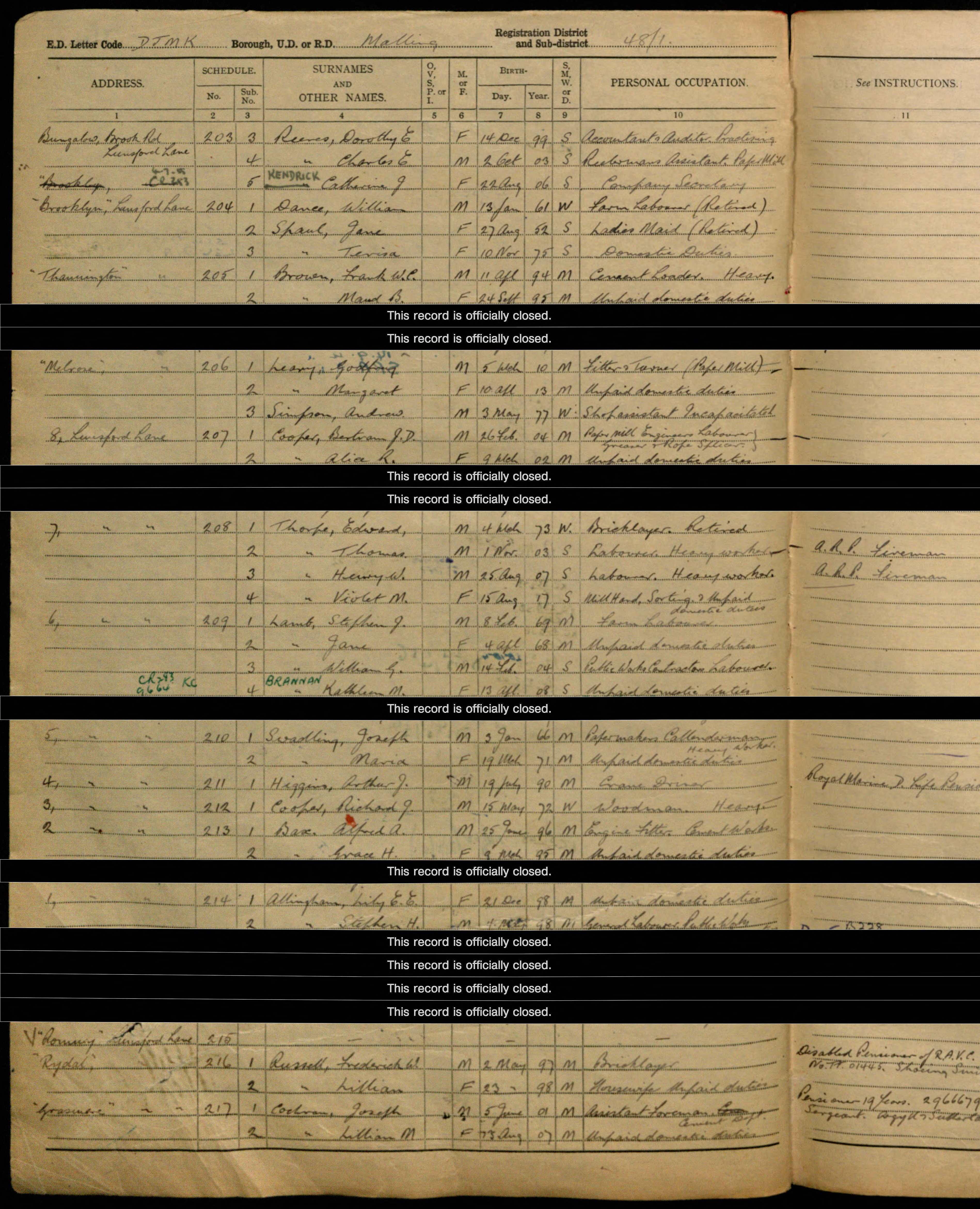 • Occupation: Retired Bricklayer, 1939, Malling R.D., Kent, England.