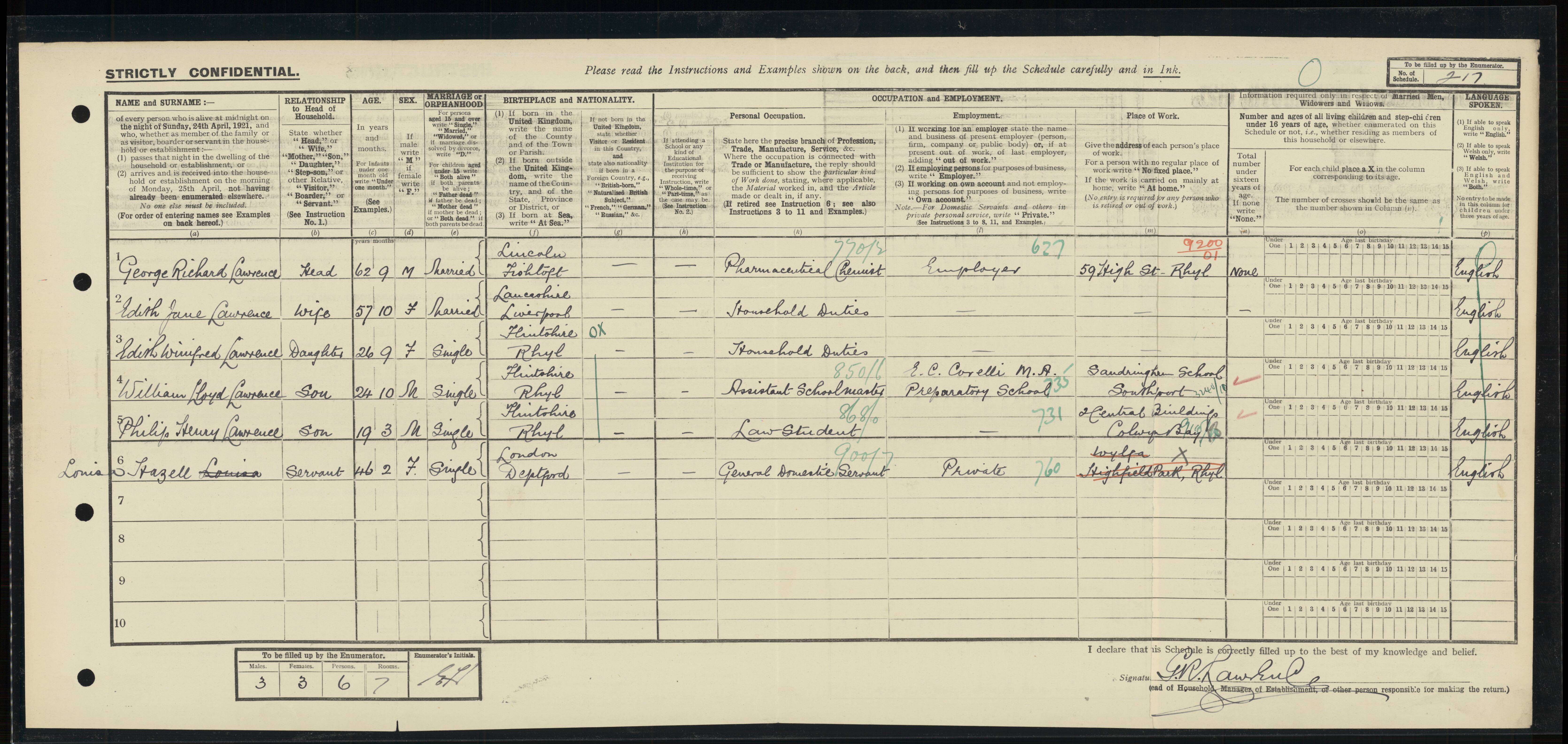 • Occupation: Pharmaceutical Chemist, 1921, Rhyl, Denbighshire & Flintshire, Wales.