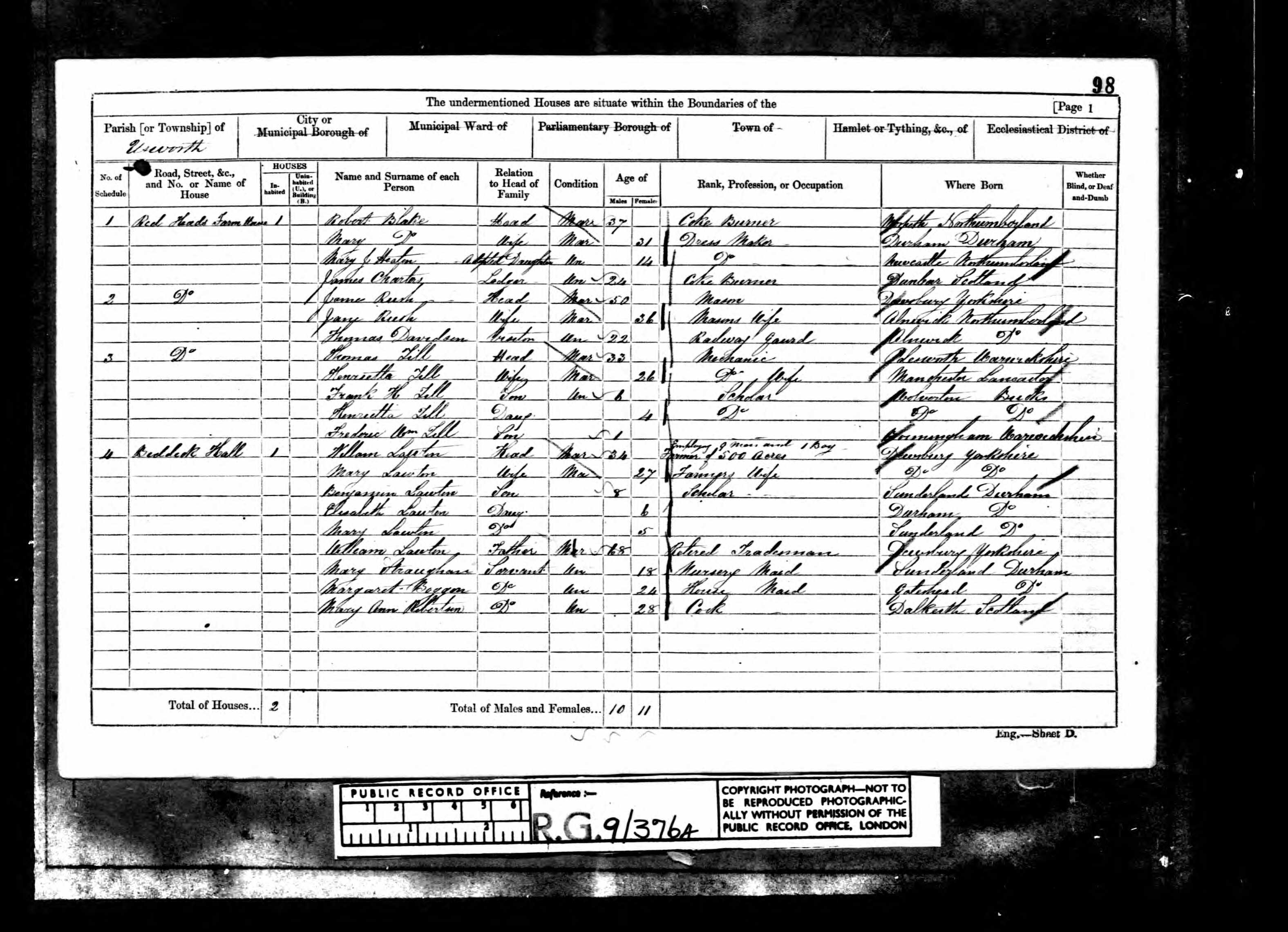 • Lived at: Beddock Hall, 1861, Usworth, Durham. Mary married William Carr Lawton Mar Q 1852 in Bishop Wearmouth. (William Carr Lawton was born circa 1827 in Dewsbury, Yorkshire & Yorkshire (West Riding), England.) |