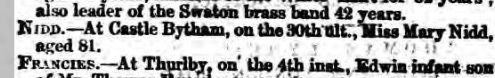 First name(s): Mary Last name: NIDD Date of burial: 3 Dec 1875 Age at death: 80 Calculated year of birth: 1795 Place of burial: Creeton Dedication: St Peter County: Lincolnshire Notes: Creeton St Peter: Denomination: Anglican Coverage: 1756 - 2001 Number of entries: 261 Data provider: Lincolnshire Family History Society