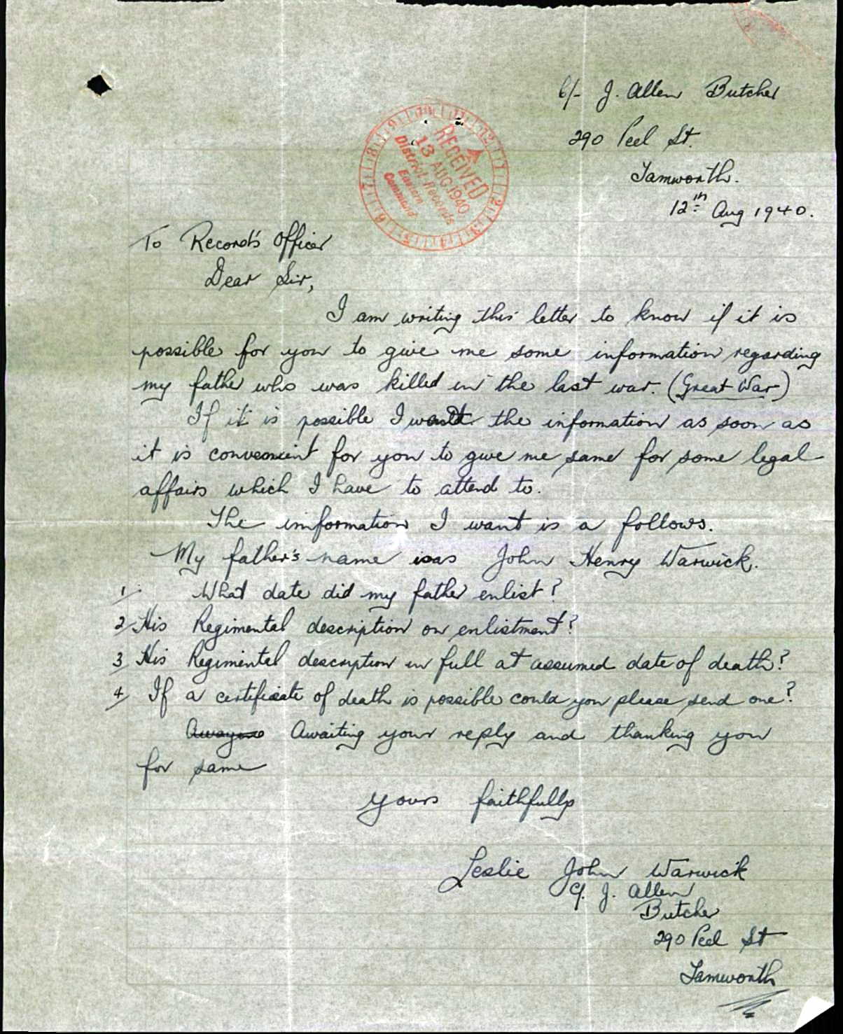 • Occupation: Butcher, 1940, Tamworth, NSW, Australia.
