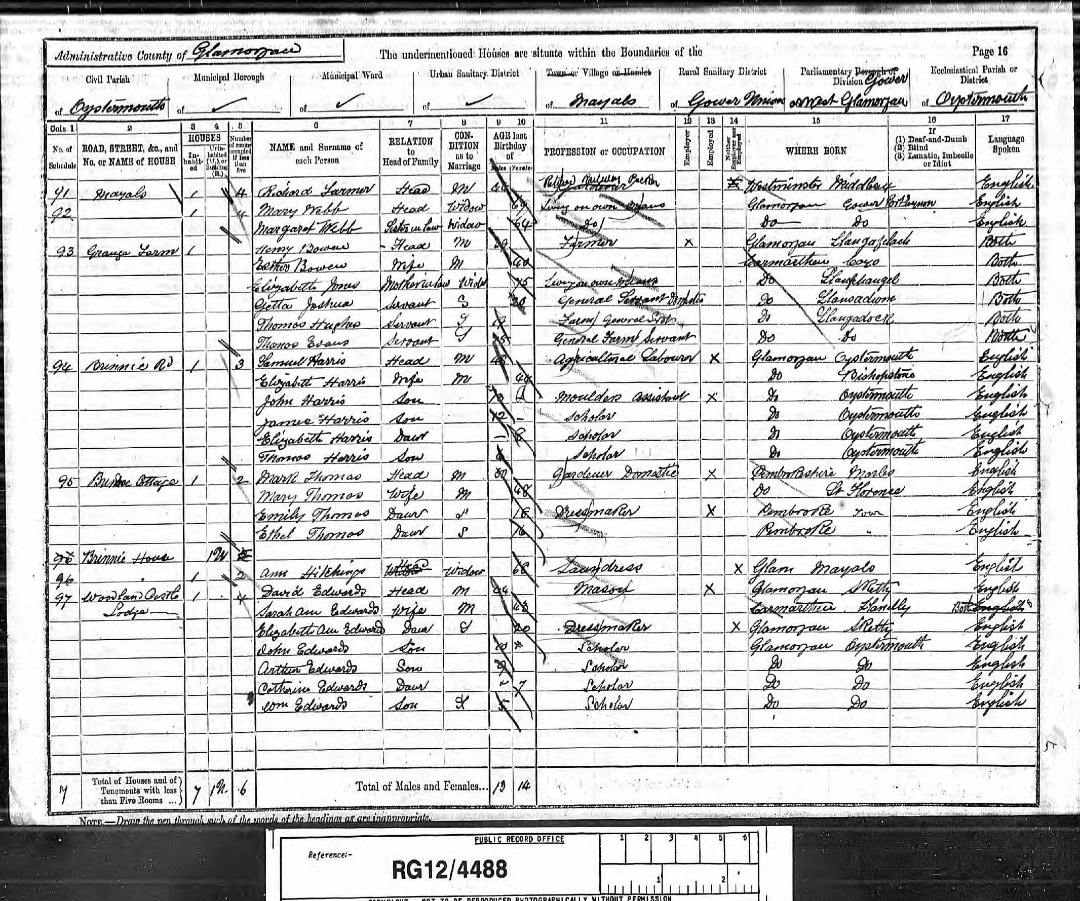 • Lived at: Brinnie Road, 1891, Oystermouth, Glamorgan, Wales. |