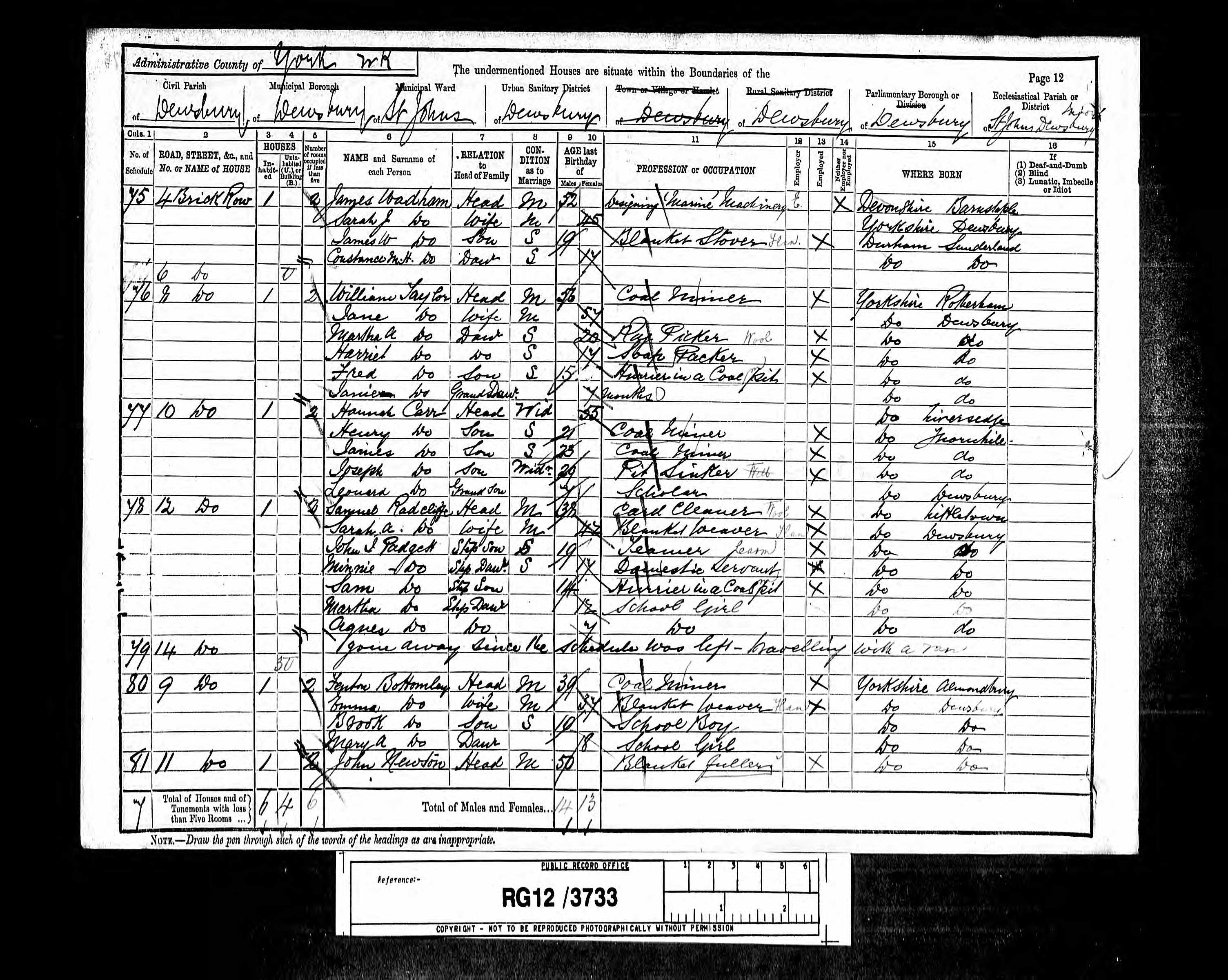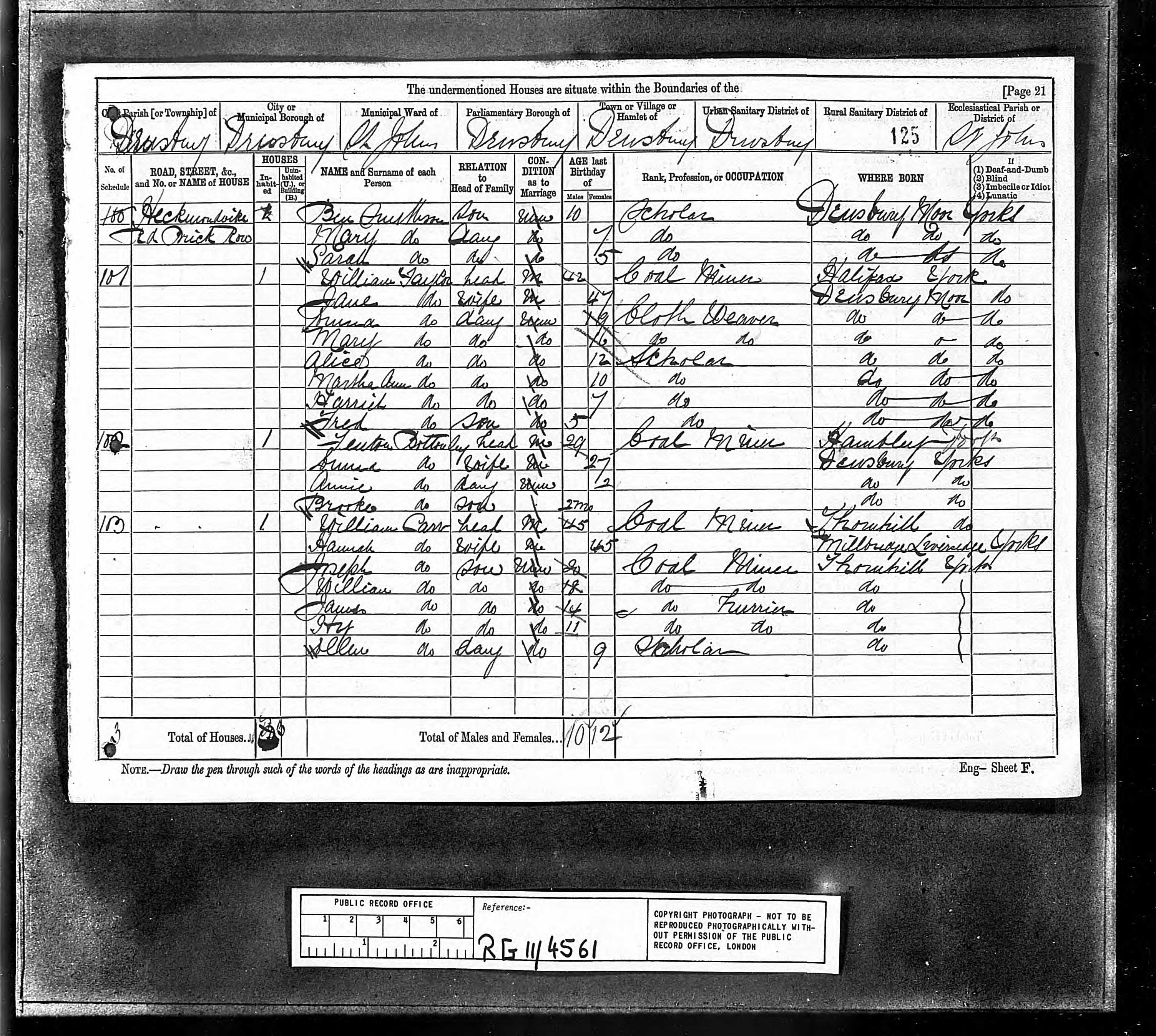 • Lived at: 10 Brick Row, 1881, Dewsbury, Yorkshire & Yorkshire (West Riding), England.