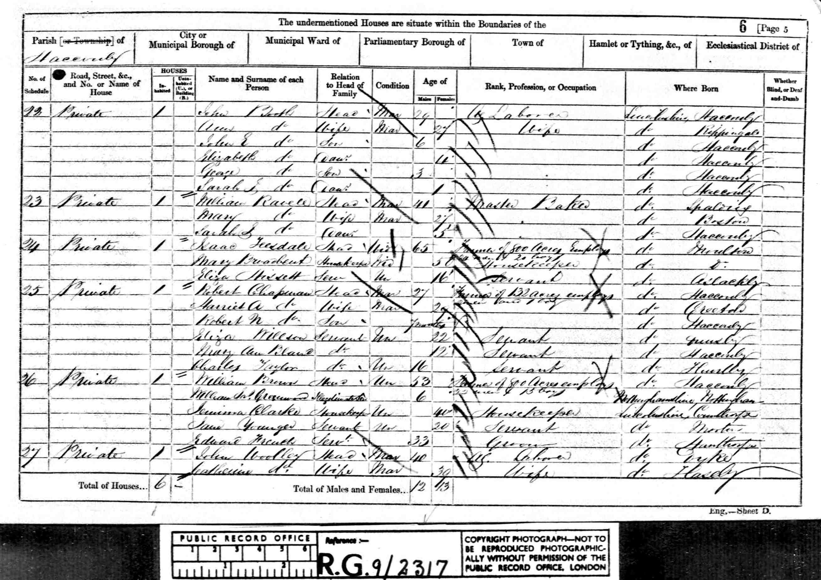 6 (1871 English and Welsh Census(London, TNA/Ancestry.co.uk, 1972) , Web site showing copies of original enumerator schedules) ID: CEN 1871, CEN 1871 rg 10 3314 pgae 14. Repository: Not Given. Cit. Date: 9 Oct 2005. Cit. ID: CEN 1871 rg 10 3314 pgae 14. Surety: 3.