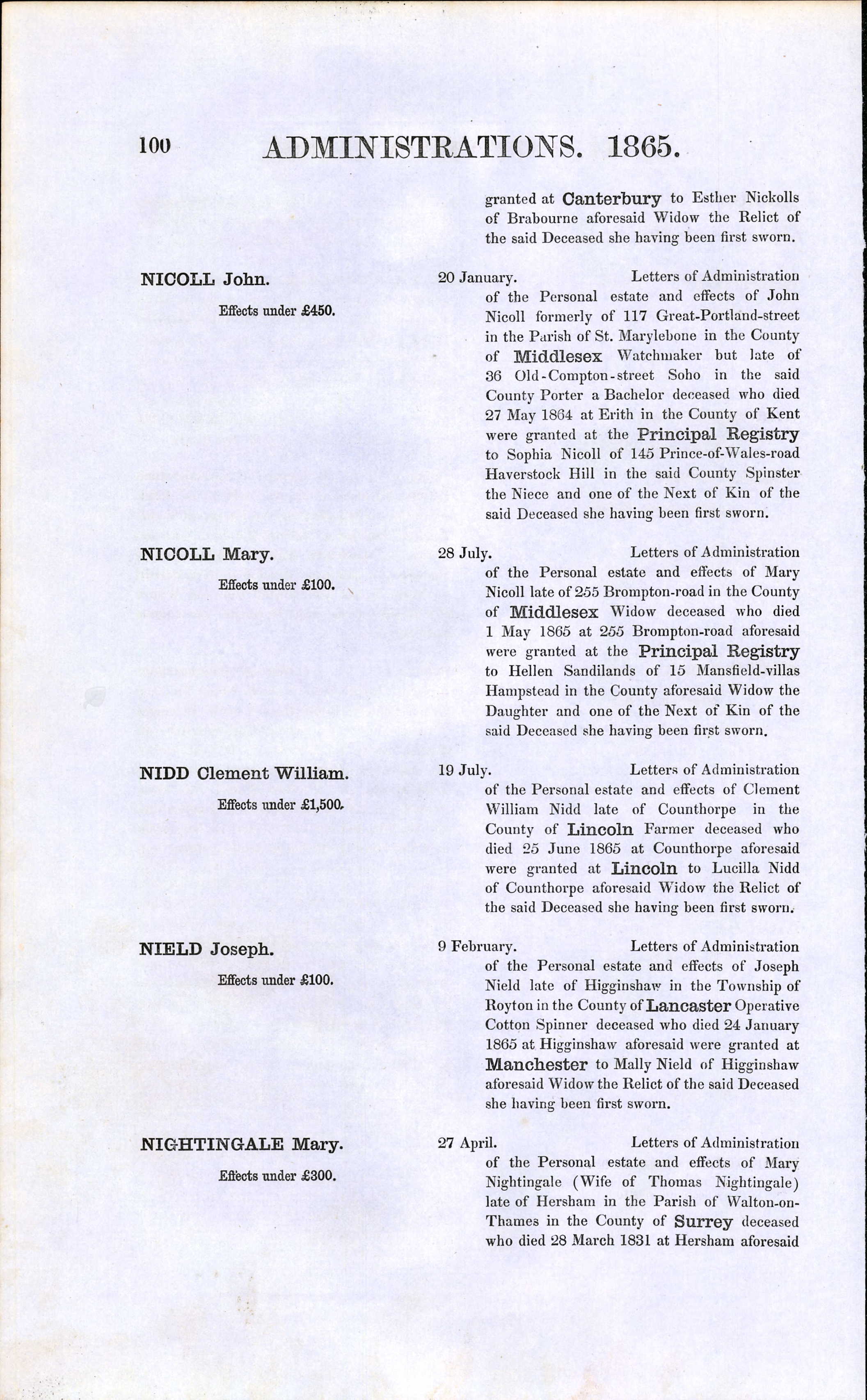 Findmypast.com, England & Wales, National Probate Calendar (Index of Wills and Administrations),1861-1941. Surety: 3. Nidd, Clement William, 10 July Effects under 1500 pounds