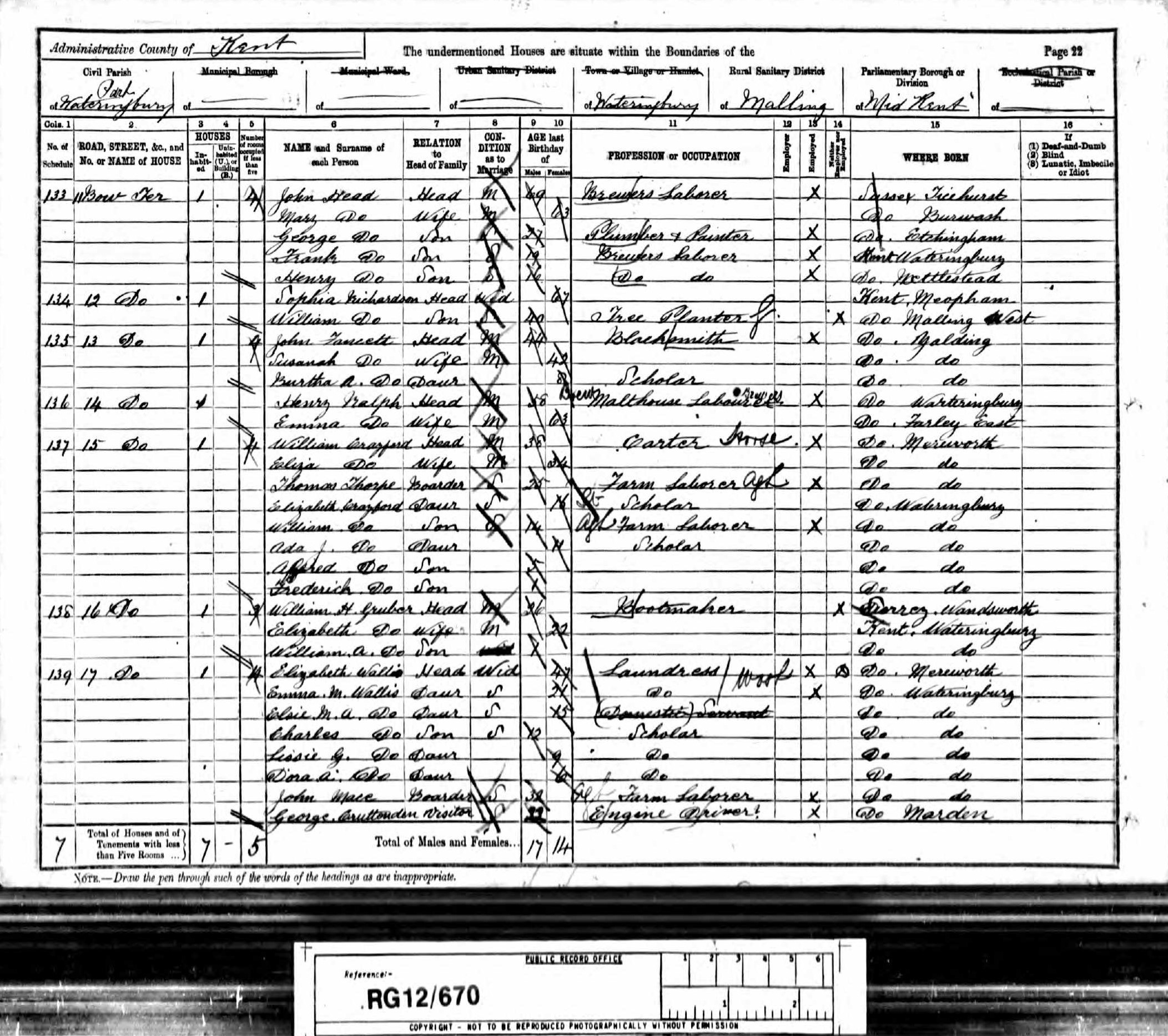 • Lived at: 17 Bow Terrace, 1891, Walteringbury, Kent, England.