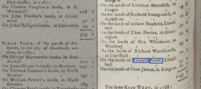• Newspaper Article: Growing of Flax, 1789, Lyonshall, Herefordshire, England. • Newspaper Article: BL_0000398_17931204_020 Hereford journal dec 4 1793 edward sayer with house to let in kington.pdf, 1793, Kington, Hereford. • Will, 1809. Edward married Margaret Kyrwood, daughter of John Kyrwood and Margaret, on 19 Nov 1767 in Burghill, Herefordshire, England.1 2 (Margaret Kyrwood was born on 24 Mar 1743 in Canon Pyon, Herefordshire, England,5 6 died in 1794 in Lyonshall, Herefordshire, England 4 and was buried on 16 Jan 1794 in Lyonshall, Herefordshire, England 4.) |