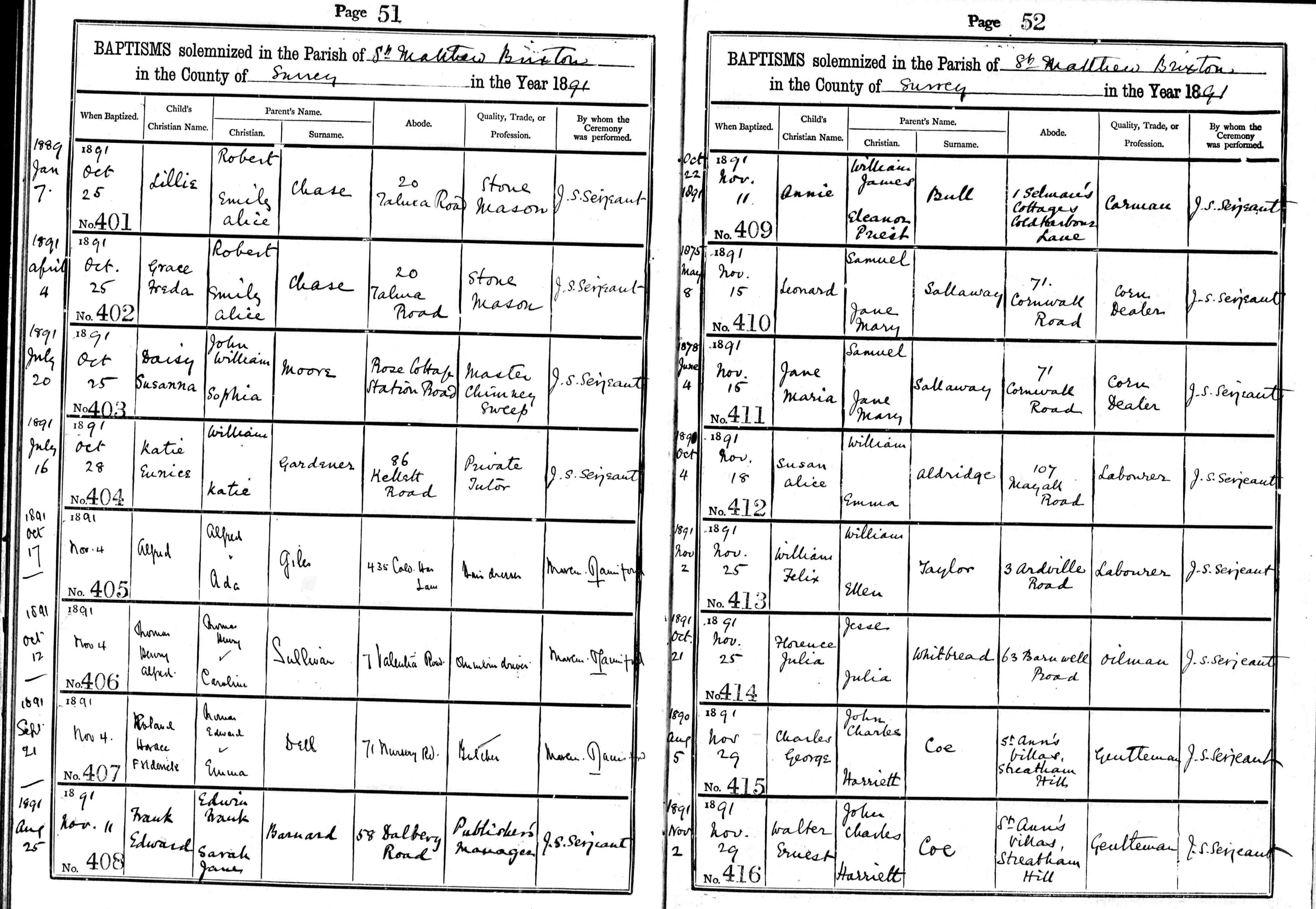 • Lived at: 58 Dalberg Road, 1901-1911, Brixton, Surrey, England. • Visited: Mr and Mrs Bradshaw, 1921, Surrey. |