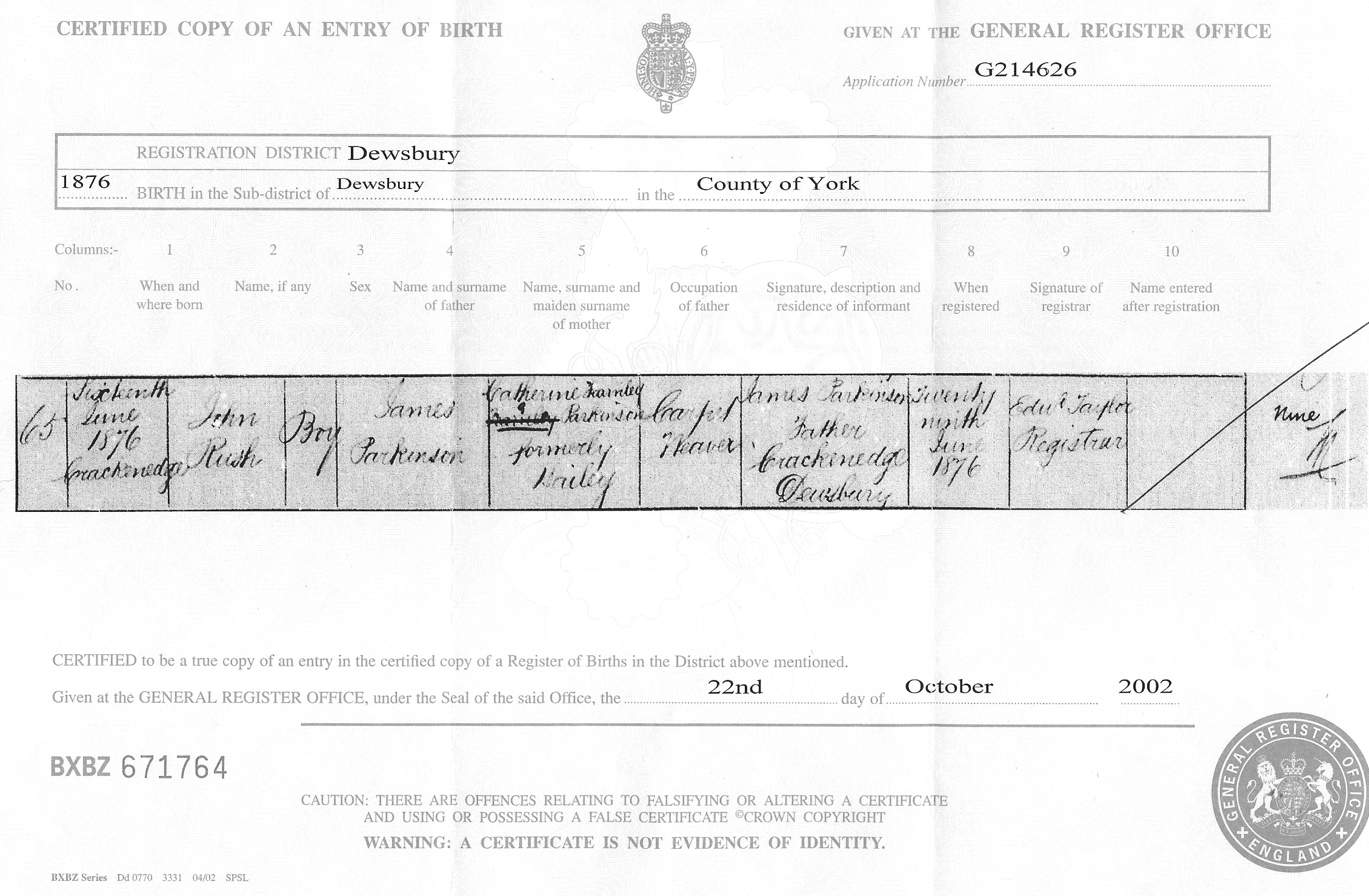 England and Wales, birth certificate for John Rush Parkinson, born Sixteenth June 1876; citing 9b/767/65, June quarter 1876, Dewsbury registration district, Dewsbury in the County of York sub-district; General Register Office, Southport. Cit. Date: Oct 2002. Cit. ID: BXBZ 671764, Surety: 4; Dewsbury
