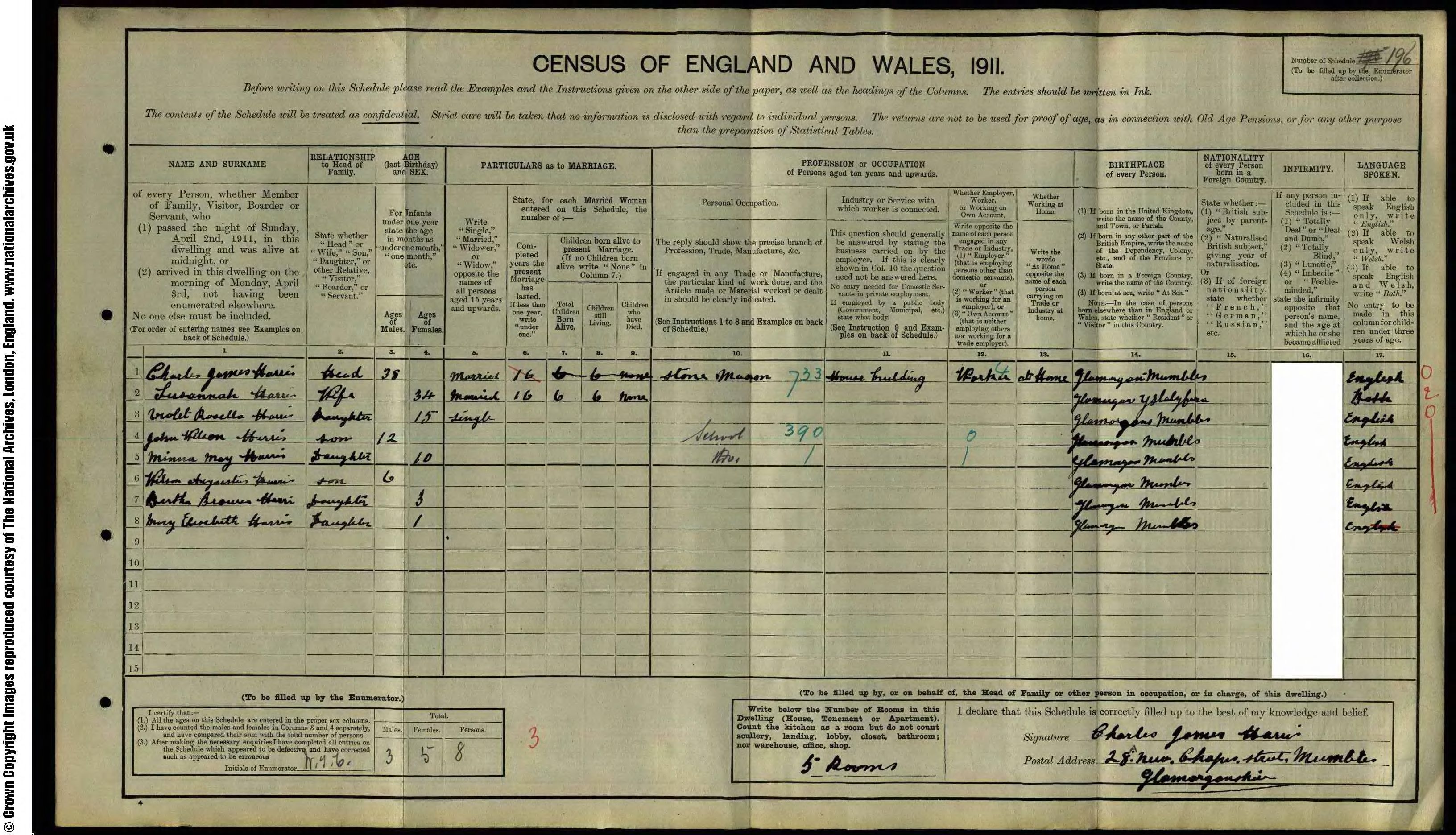 • Occupation: Mason, 1911, Mumbles, Glamorgan, Wales.