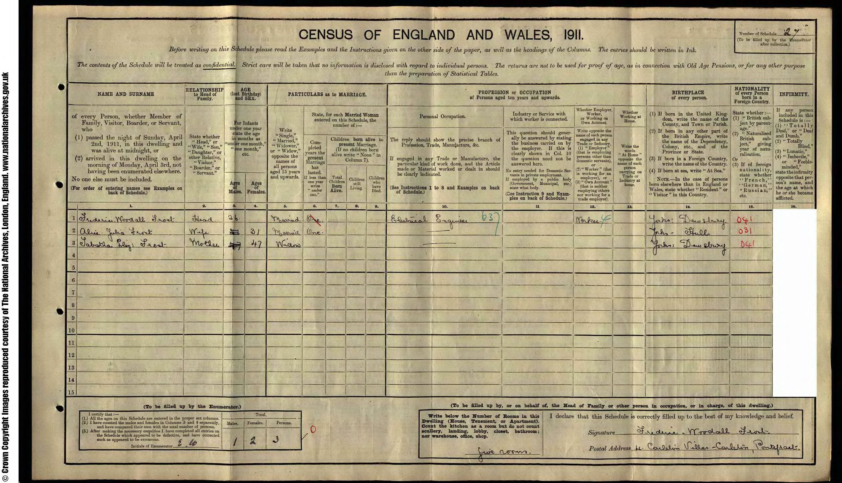 • Lived at: 4 Carleton Villas, Carleton, 1911, Pontefract.