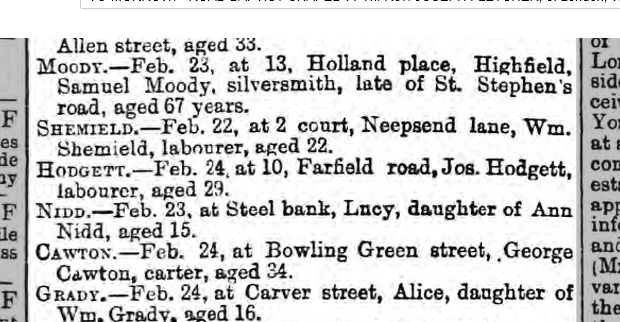 Name Age Alfred Nidd 8 Amy Nidd 1 Ann Nidd 36 Ann Nidd 15 Elizabeth Nidd 10 John Nidd 39 John William Nidd 43 Lucy Nidd 6 Savannah Nidd