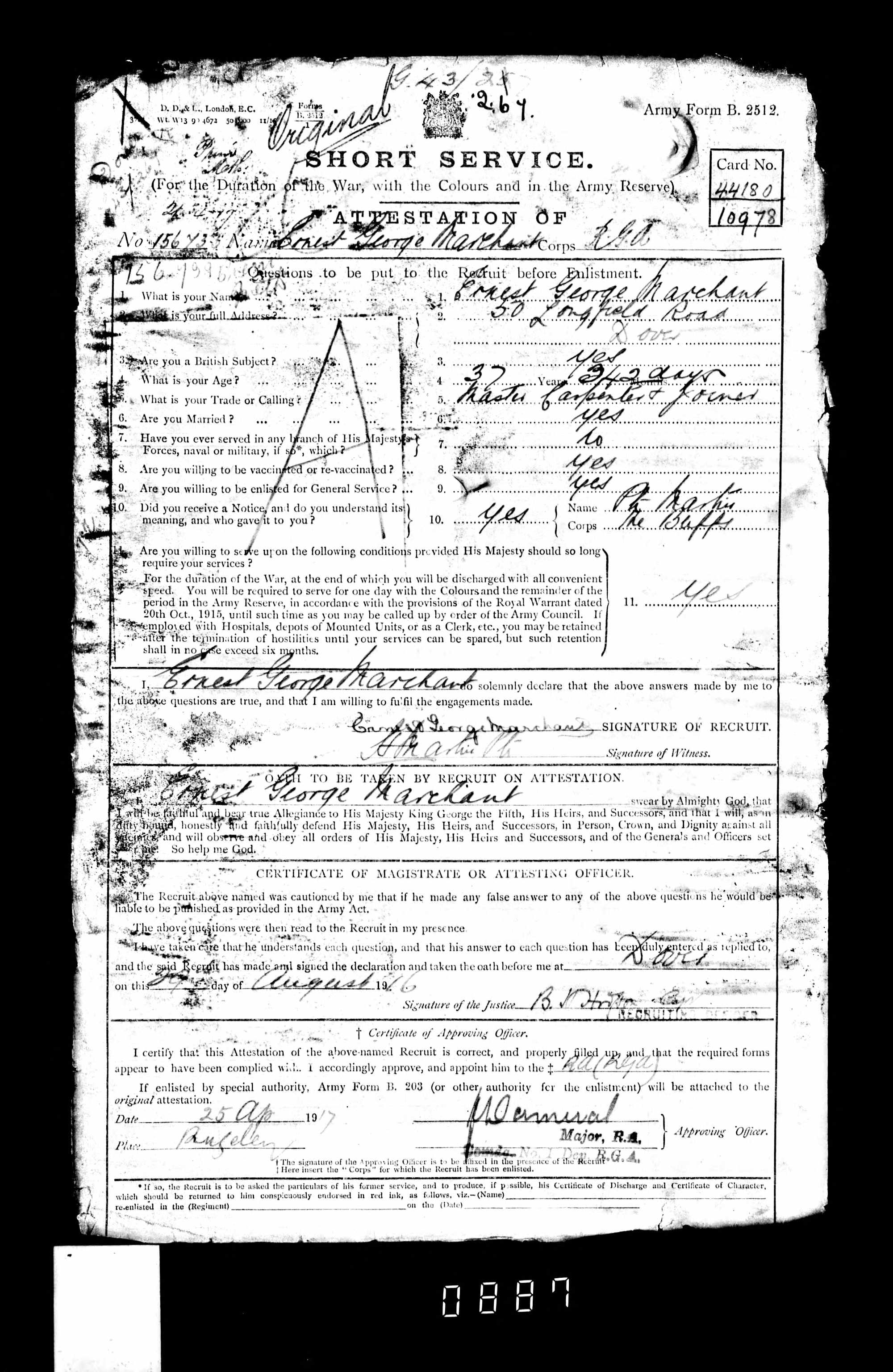 • Military: Short Attestation, 1916, Dover, Kent, England.