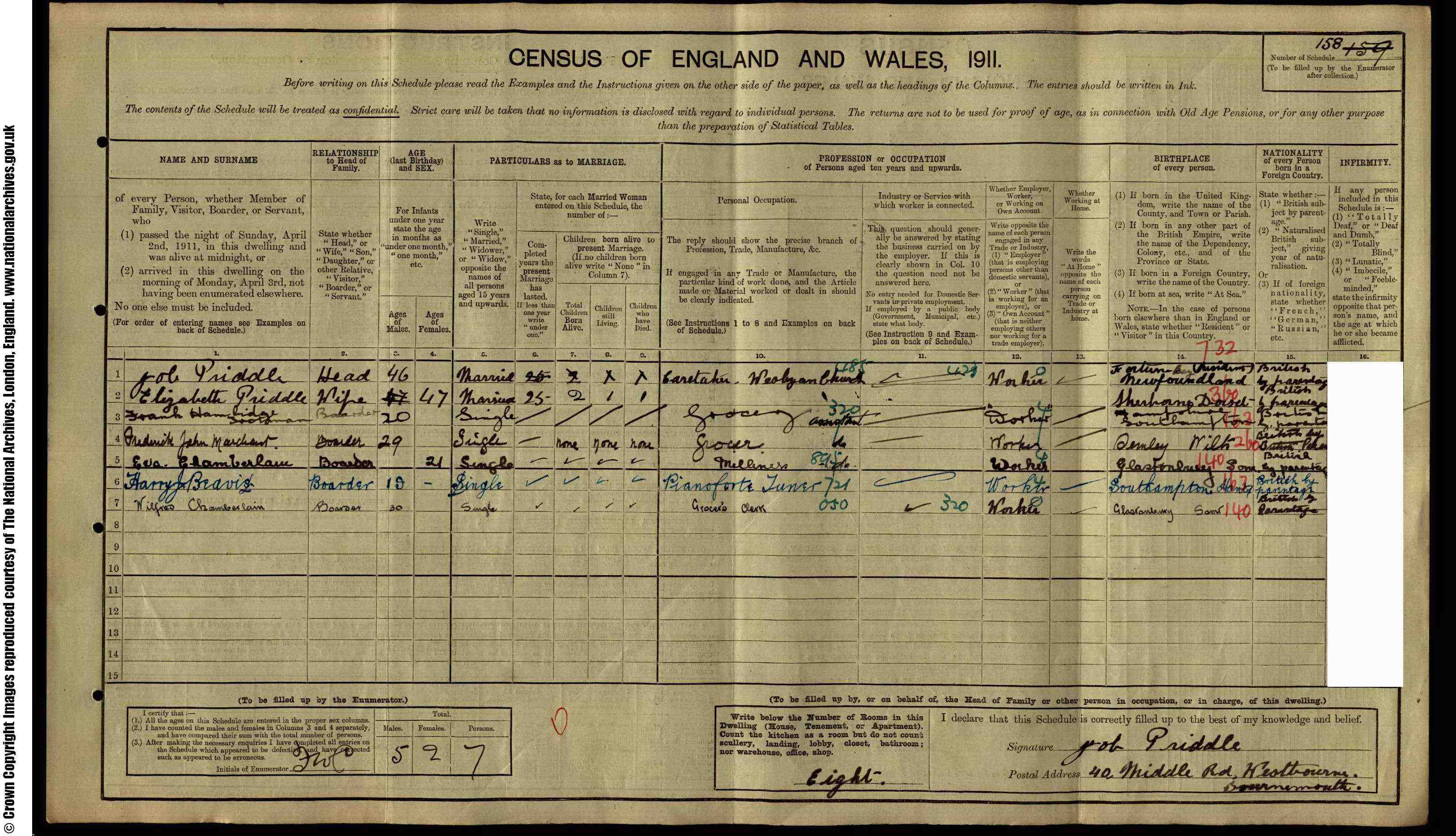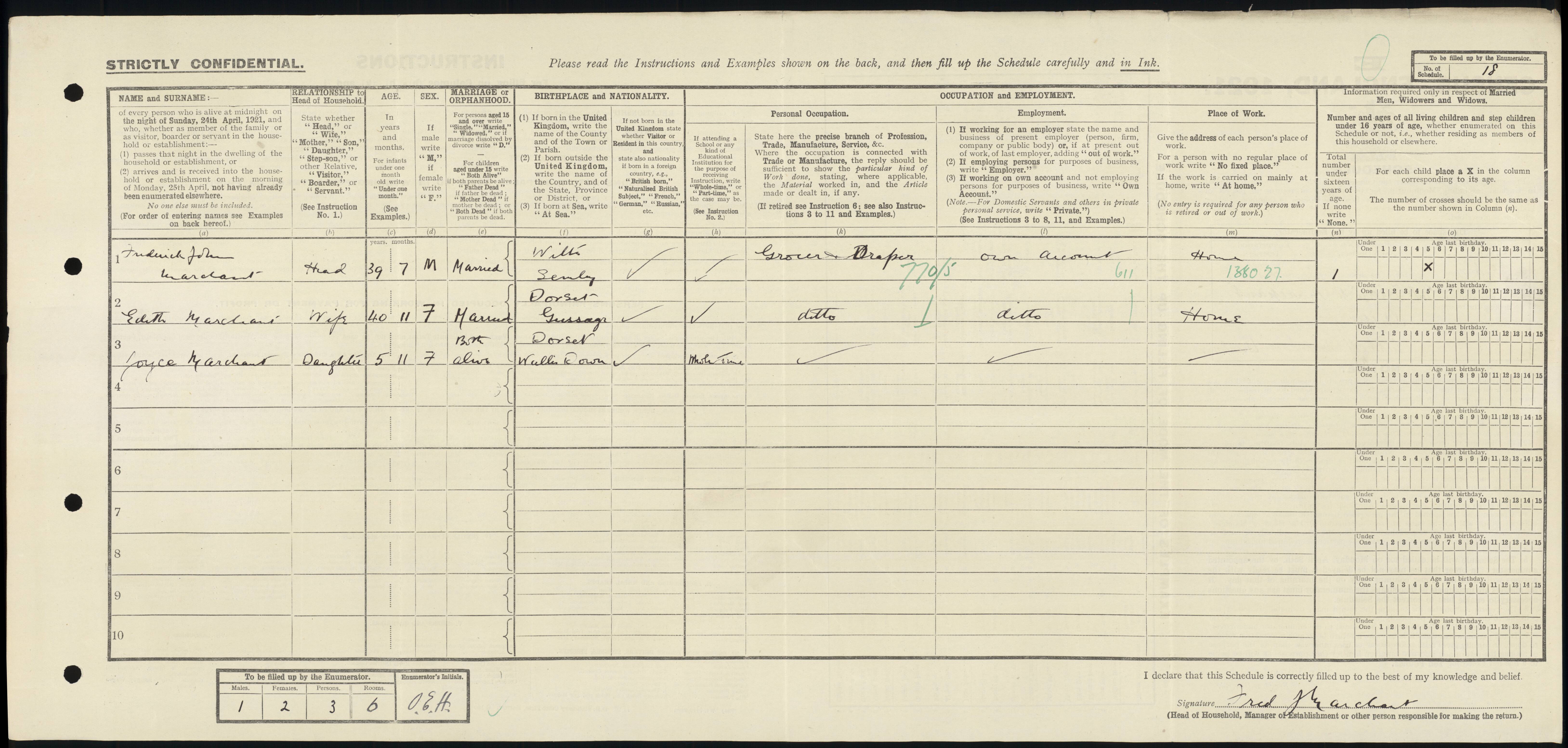Another name for Frederick was Frederick Merchant.1 Baptism Notes: Name: Events • Lived at: The Glebe, 1891, Semley, Wiltshire, England. 1 • Occupation: Grocer, 1911, Westbourne, Bournemouth.