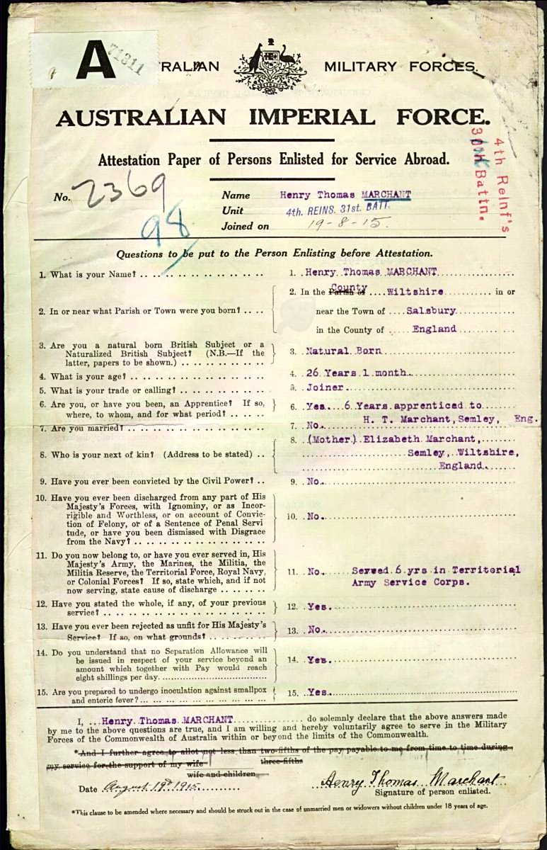 • Military: served in WWI for Australian Army, 1915-1919. Henry married Mrytle Amber Sawtill in 1926 in NSW, Australia. |