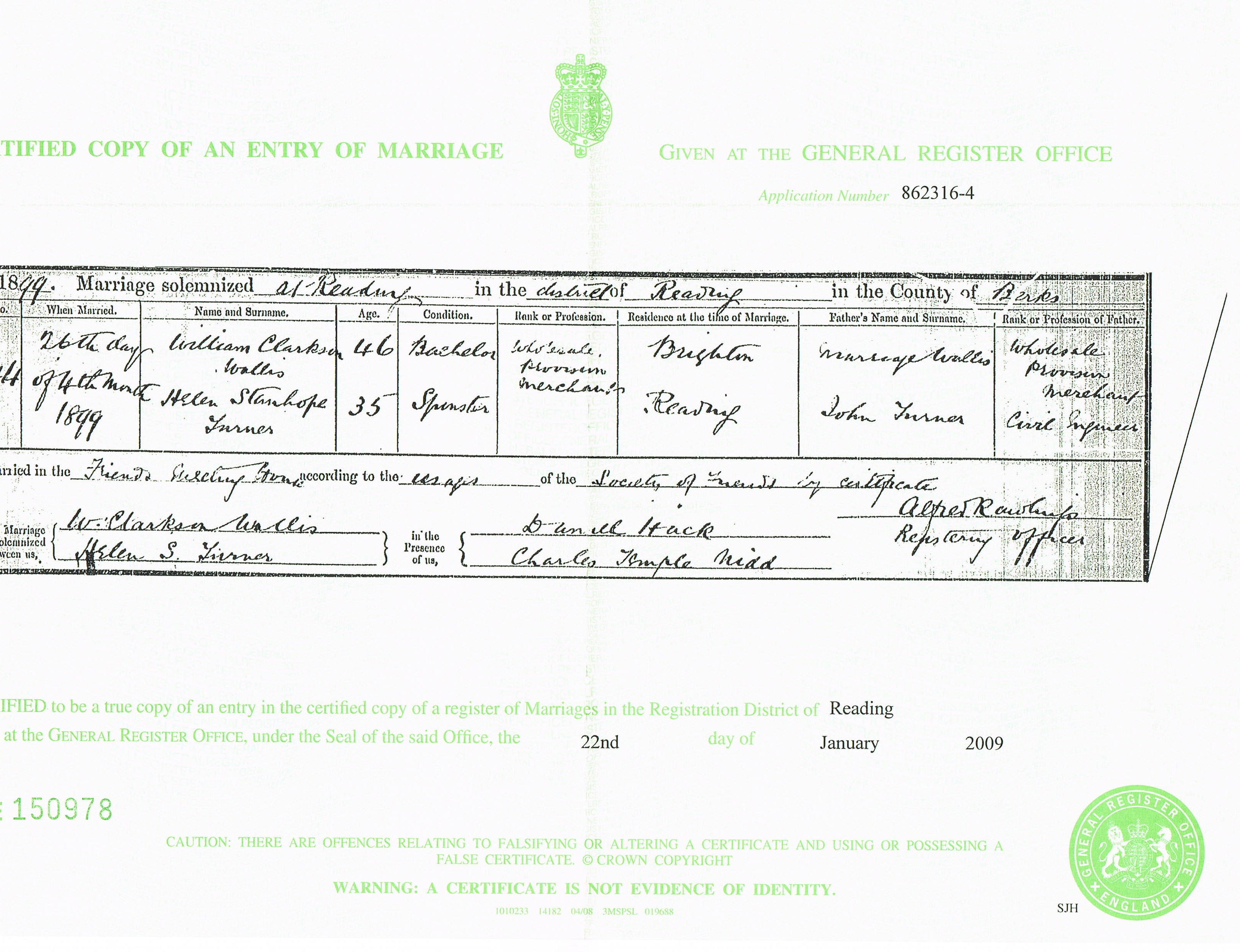 England and Wales, marriage certificate for William Clarkson Wallis and Helen Stanhope Turner, married 26th Day of 4th Month; citing 2c/889/44, June quarter 1899, Reading registration district, Reading sub-district; General Register Office, Southport. Cit. Date: 29 Jan 2009. Cit. ID: MXE 150978, Surety: 4; 1899