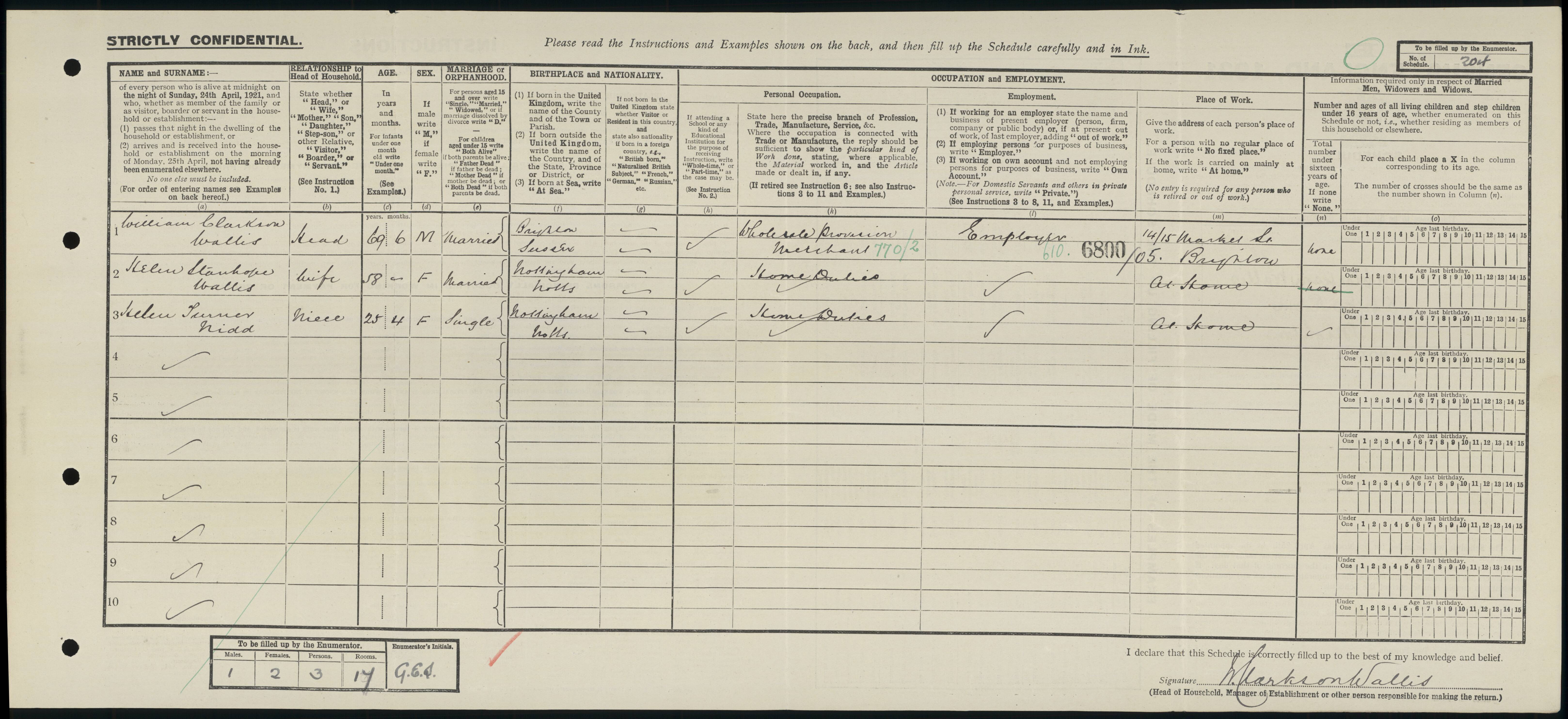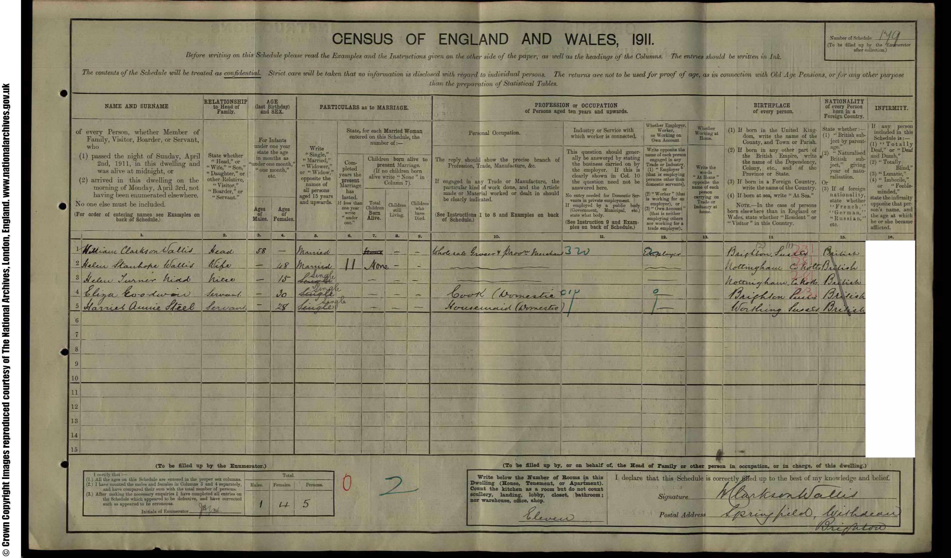 1911 census of England, Yorkshire, Springfield, Withdean, Helen Stanhope Wallis (nee Turner) and family; digital images, 1911 Census .co.uk(http://www.1911census.co.uk); citing RG 78, RG 14 PN PN5173, registration district (RD) RD80, sub district (SD) SD1, enumeration district (ED) ED21, schedule number (SN) SN179). Cit. Date: 15 Jan 2009. Surety: 4; NIDD HELEN TURNER (RG14PN5173 RD80 SD1 ED21 SN179); NOte