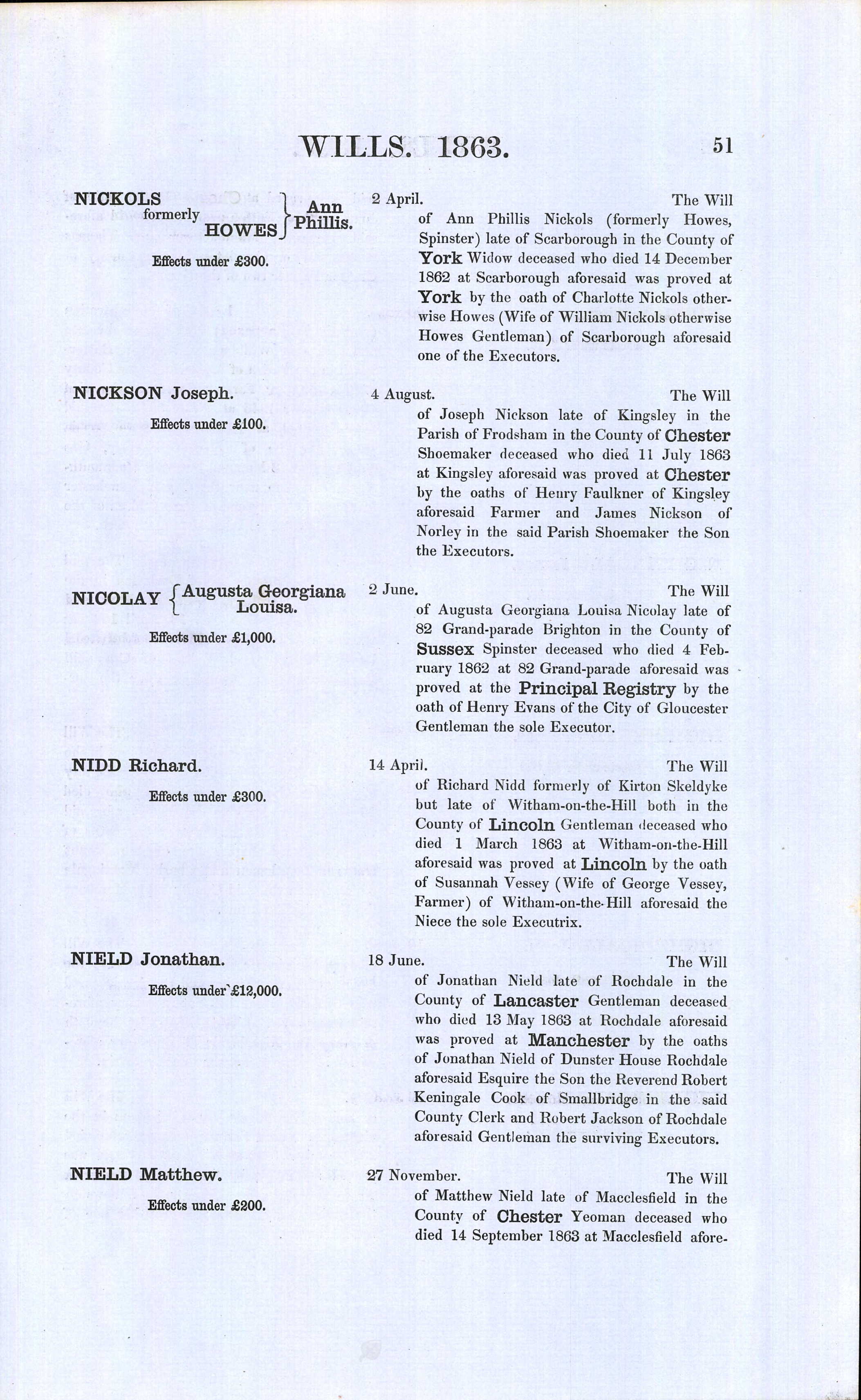 The will of RIchard Nidd formerly of Kirton, Skeldyke, but late of WItham-on-the-hill both in the county of Lincoln Gentleman, deceased who died March 1, 1863 at Witham-on-the-hill, aforesaid was proved at Lincoln, by the oath of Suzanna Vesey (wife of George Vesey, Farmer) of Witham-on-the-Hill, aforesaid the Neice the sole executrix.