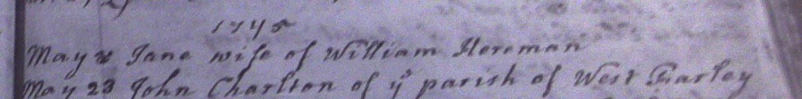 Jane married William Herriman, son of John Herriman and Mary Wheeler, on 28 Dec 1724 in Offham, Kent, England.1 2 3 (William Herriman was born on 6 Aug 1704 in Woolwich, England 9, baptized on 7 Aug 1704 in St. Mary Magdalene, Woolwich, died in Nov 1777 in Mereworth, Kent, England 8 and was buried on 27 Nov 1777 in Boughton Monchelsea, Kent, England. 8.) |