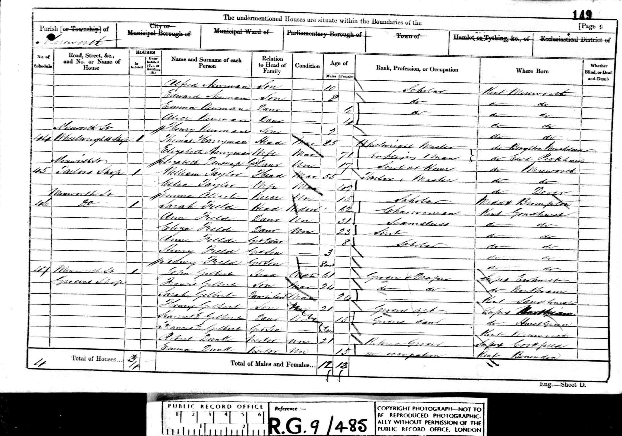 1 (1861 English and Welsh Census(London, TNA/Ancestry.co.uk, 1962) , Web site showing copies of original enumerator schedules) ID: CEN 1861, CEN 1861 rg9 485 149 9. Repository: LDS, Brampton. Cit. Date: 1 Oct 2005. Cit. ID: CEN 1861 rg9 485 149 9. Surety: 3.