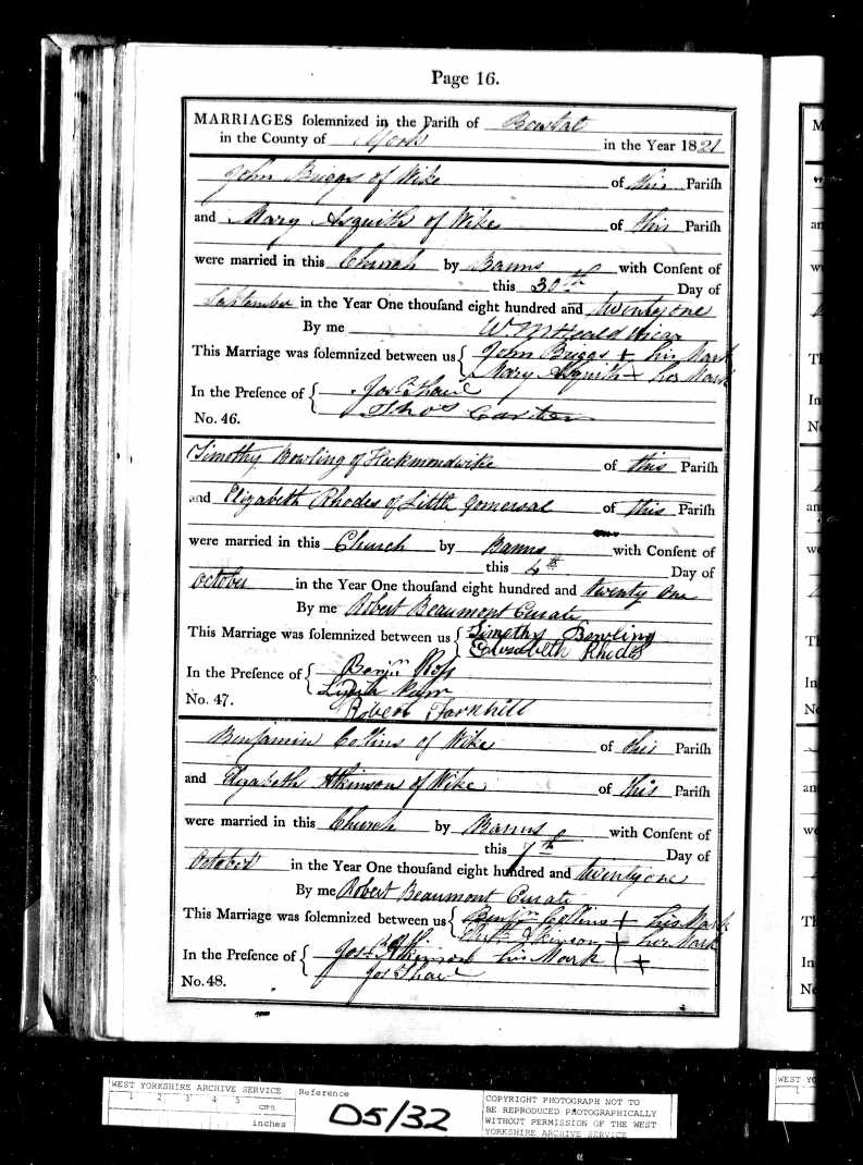 Timothy married someone Elizabeth Rhodes on 4 Oct 1821 in Birstall, Yorkshire, England. (Elizabeth Rhodes was born in Little Gomersall, Yorkshire.) |