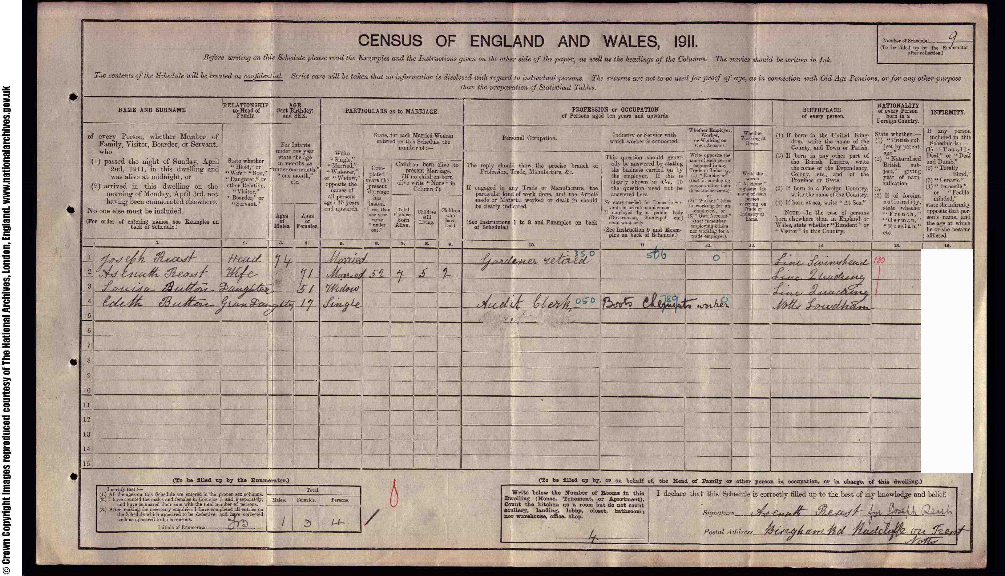 • Occupation: Gardener, 1911-1919, Radcliffe on Trent, Nottingham. Joseph married Asenath circa 1859. (Asenath was born circa 1840 in Quadring, Lincolnshire, England and died Jun Q 1914.) |