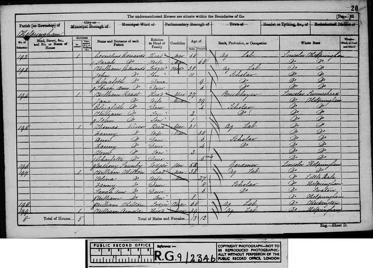 • Lived at: Bridge Foot, 1881, Sleaford, Lincolnshire, England. William married Jane Thorlby Jun Q 1856 in Sleaford, Lincolnshire, England. (Jane Thorlby was born circa 1841 and died Sep Q 1868.) William next married Charlotte Dec Q 1878 in Sleaford, Lincolnshire, England. (Charlotte was born circa 1841 and died after 1881.) |