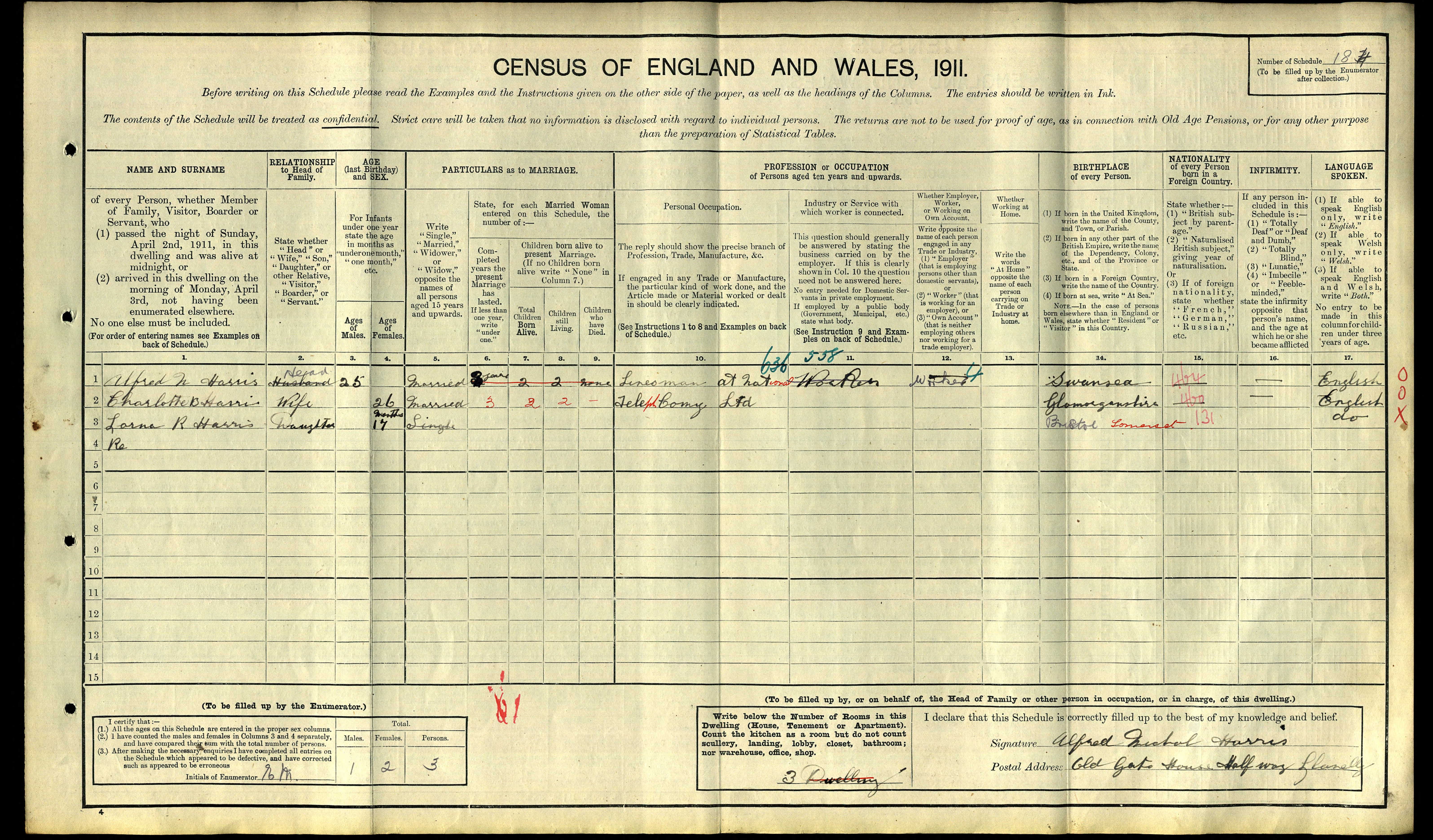 Alfred married Charlotte Bertha Washer on 19 Apr 1908 in Swansea. (Charlotte Bertha Washer was born in 1885 and died Dec Q 1961 in Llanally.)