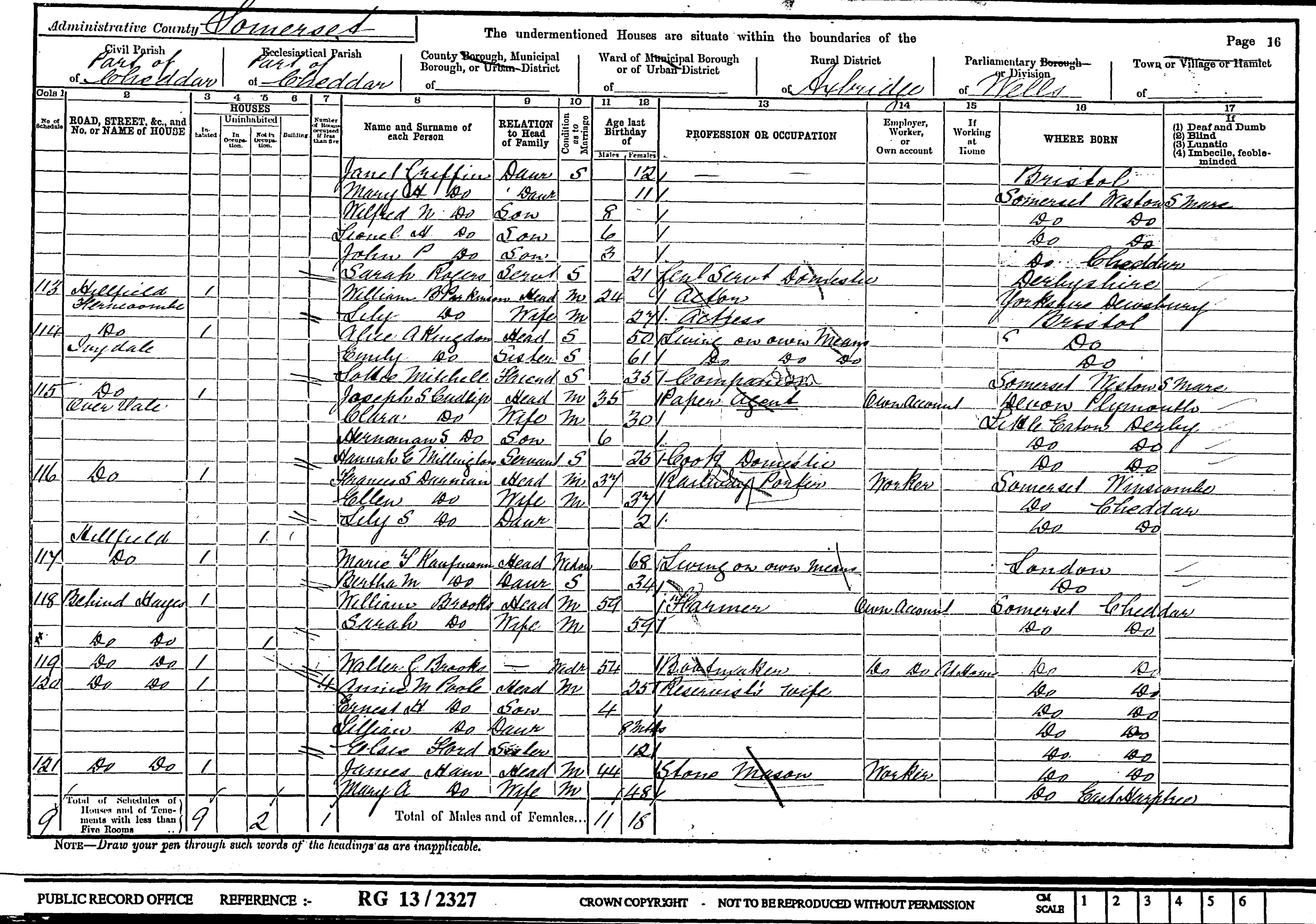 4 (1901 English and Welsh Census(London, TNA/Ancestry.co.uk, 2002) , Web site showing copies of original enumerator schedules) ID: CEN 1901, RG13/2327 Part of Cheddar Axbridge Wells page 16. Cit. Date: 16 Feb 2004. Cit. ID: CEN 1901 RG13/2327. Surety: 3.