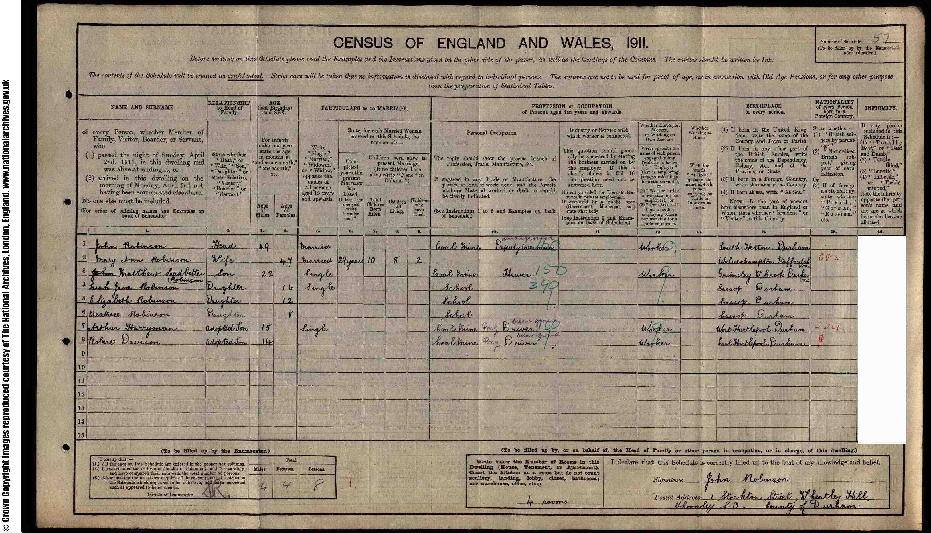 • Occupation: Coal Miner, 1911, Durham, Ontario. • Lived at: 41 Coopers Terrace, 1921, Thornley, Durham. • Occupation: Coal Miner, 1921, County Durham.