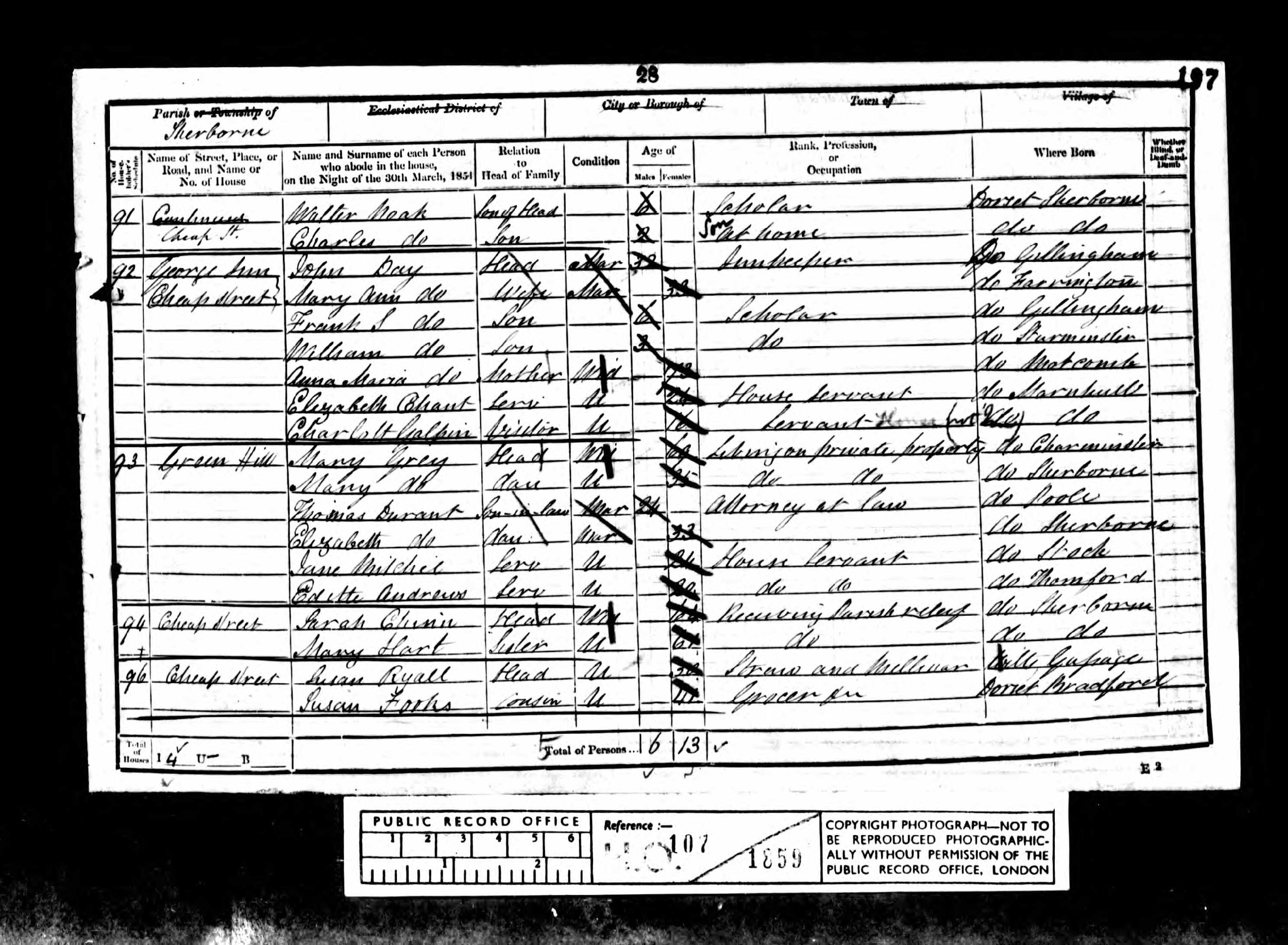 • Lived at: The George Inn, Cheap Street, 1851, Sherborne, Dorset.