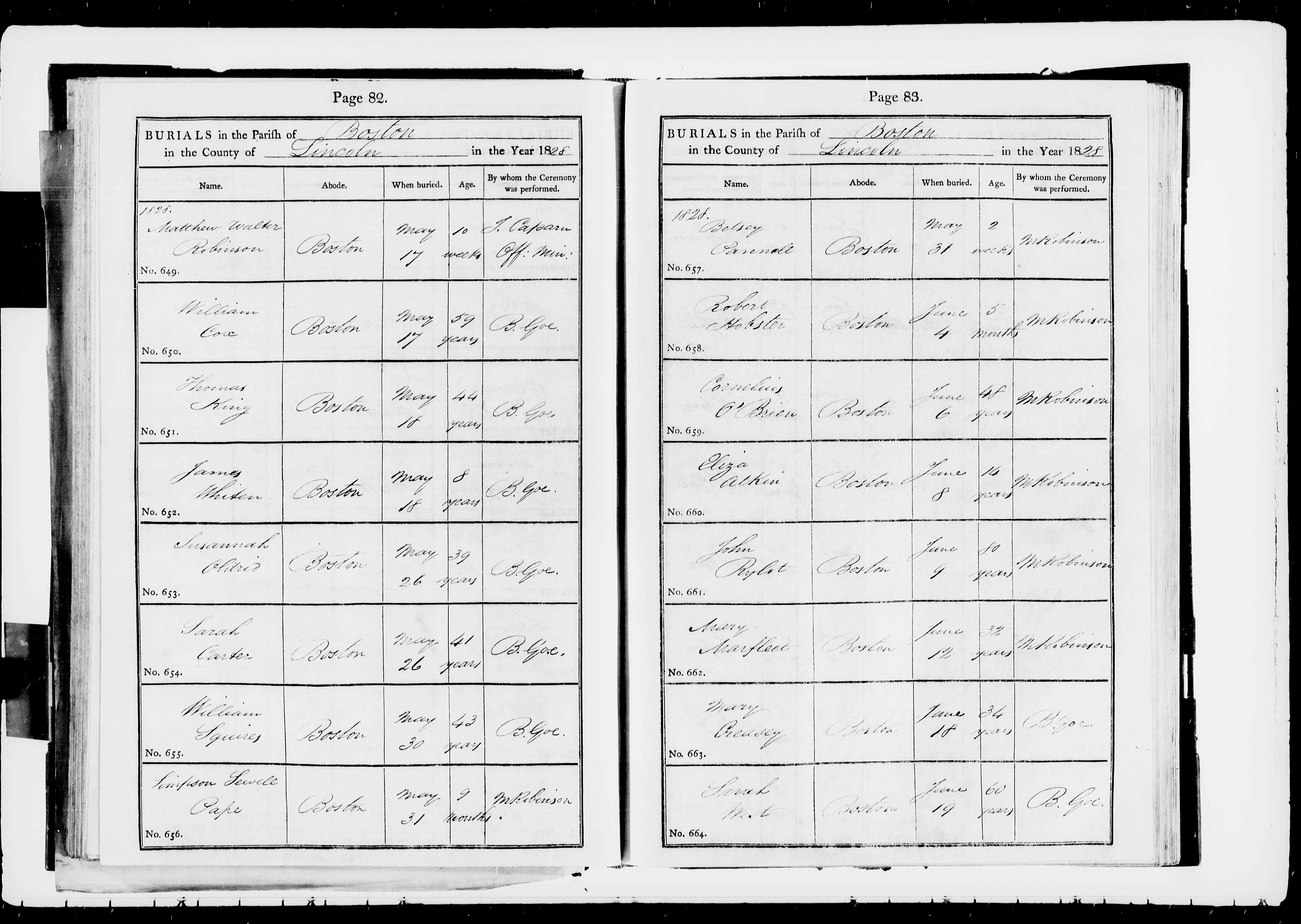 • Burial Image: Parish Record, 1828, Boston, Lincolnshire, England. John married Mary Fox on 3 Feb 1766 in Boston, Lincolnshire, England. (Mary Fox was born in 1745 in Boston, Lincolnshire, England and died before 1796.) John next married Susanna on 6 Jun 1796 in Coningsby, lincolnshire. |