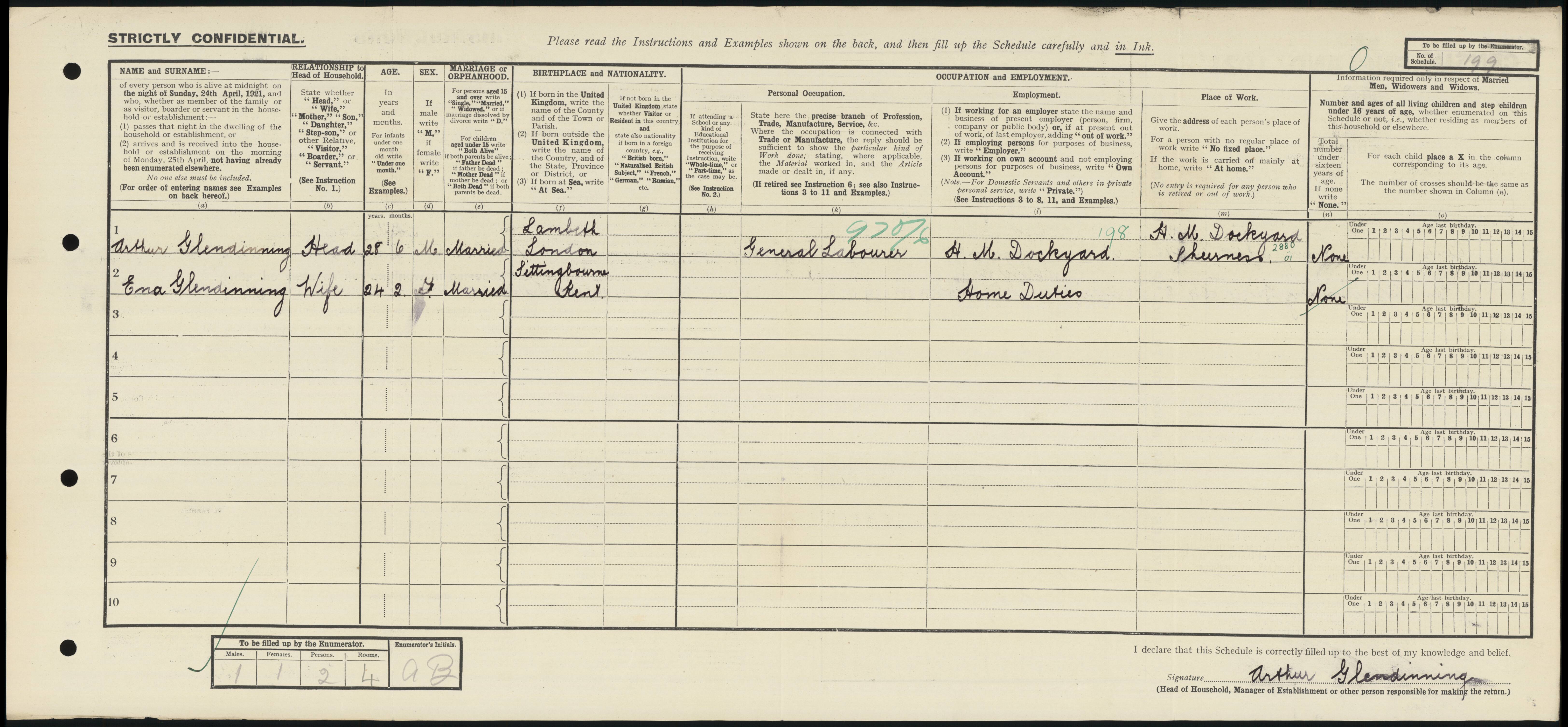 • Lived at: 65 James Street, Sheerness, 1921, Kent, England. Florence married Arthur G. Glendinning Dec Q 1915 in Milton. (Arthur G. Glendinning was born on 21 Dec 1892 and died on 15 Jun 1953 in Isle of Sheppey, Kent.) |