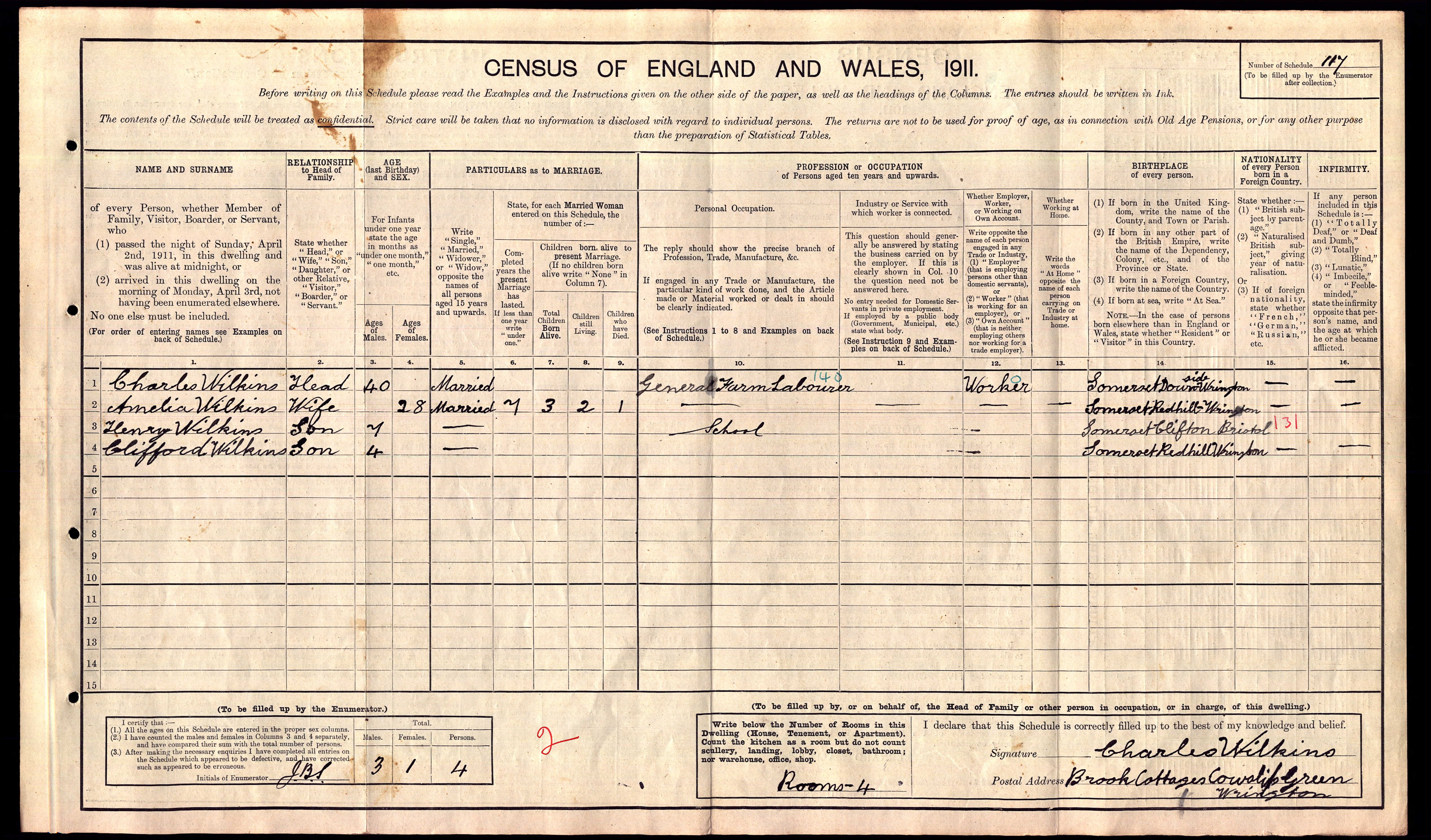 • Lived at: No 3 Paradise Cottage, Brook Cottage, Cowslip Green, Redhill, Wrington, 1911. |