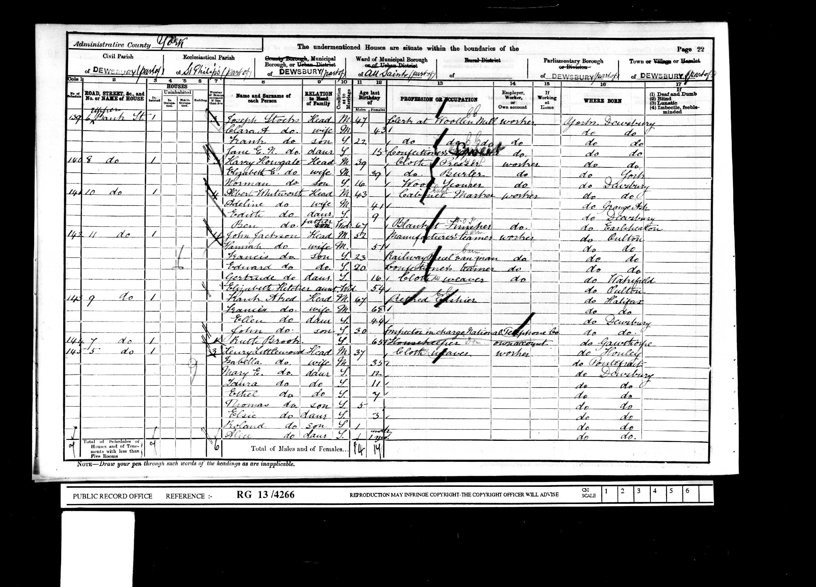 • Lived at: 10 Upper Bank Street, 1911, Dewsbury C.B., Yorkshire (West Riding), England.