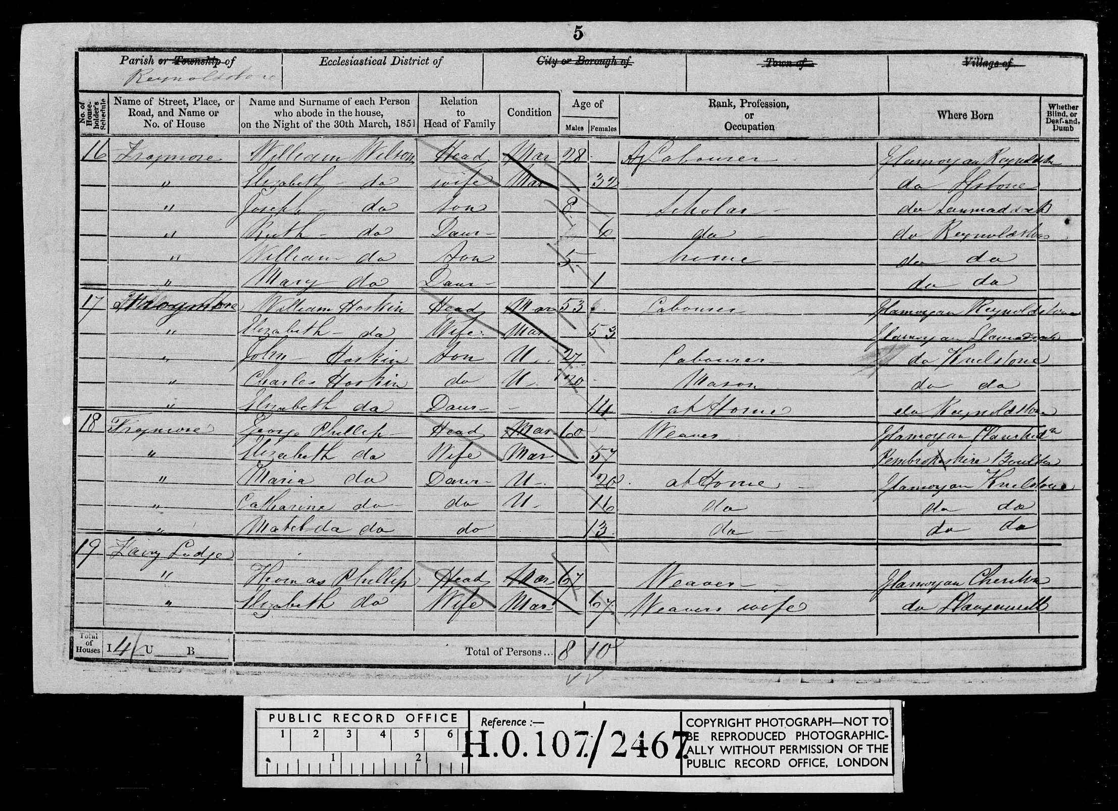 • Lived at: Frogmore, 1851, Reynoldston, Swansea, Glamorganshire, Wales. |