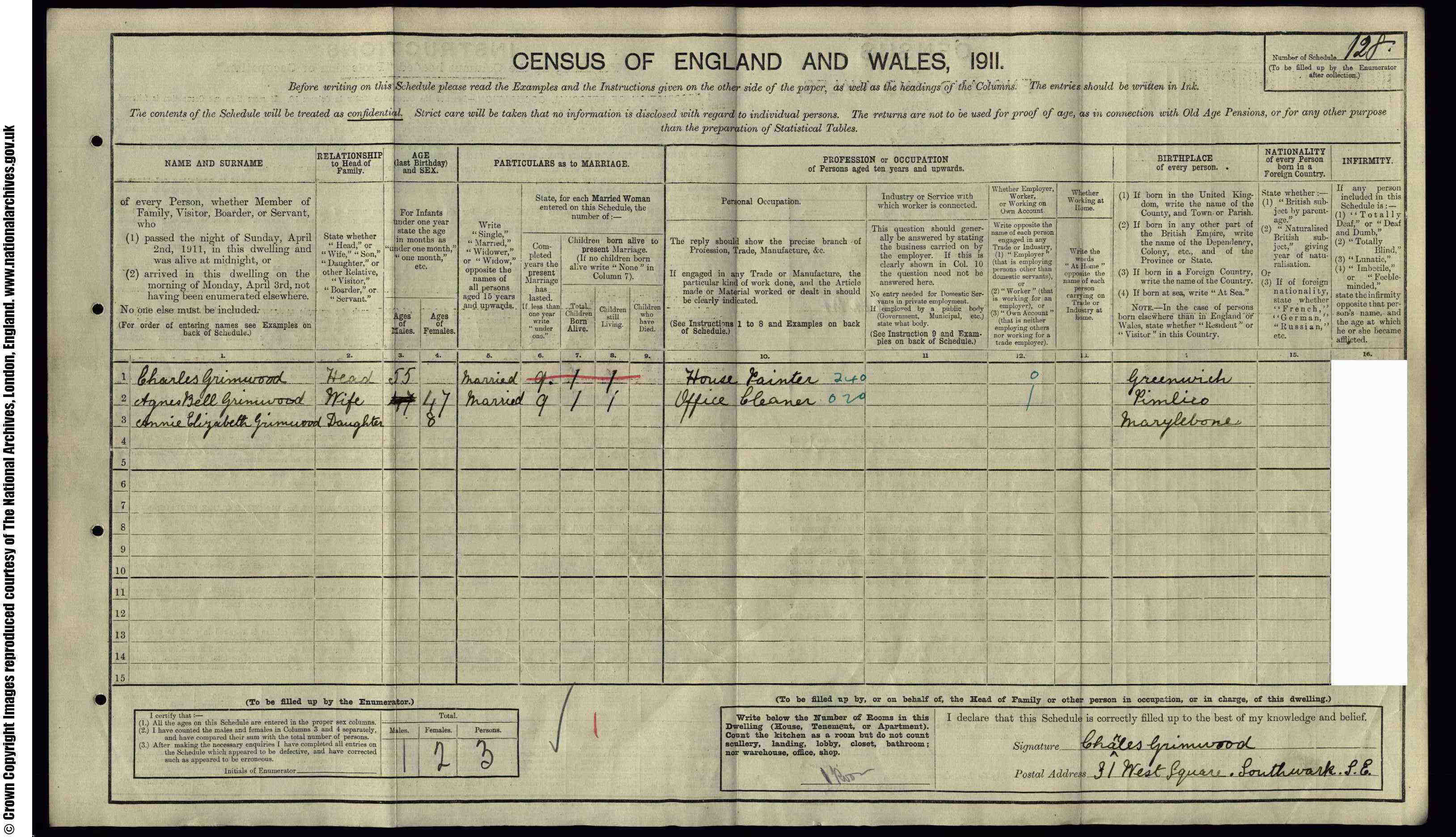 • Lived at: 31 West Square, 1911, Southwark, Surrey, England.
