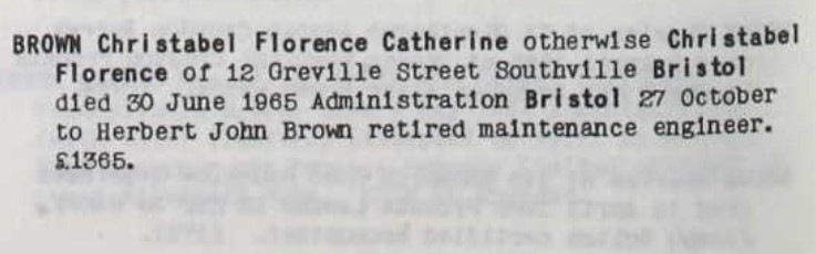 • Probate: 1365 pounds, 30 Jun 1965, Bristol, Gloucestershire, England. probate granted to Herbert John Brown retired (assume husband)