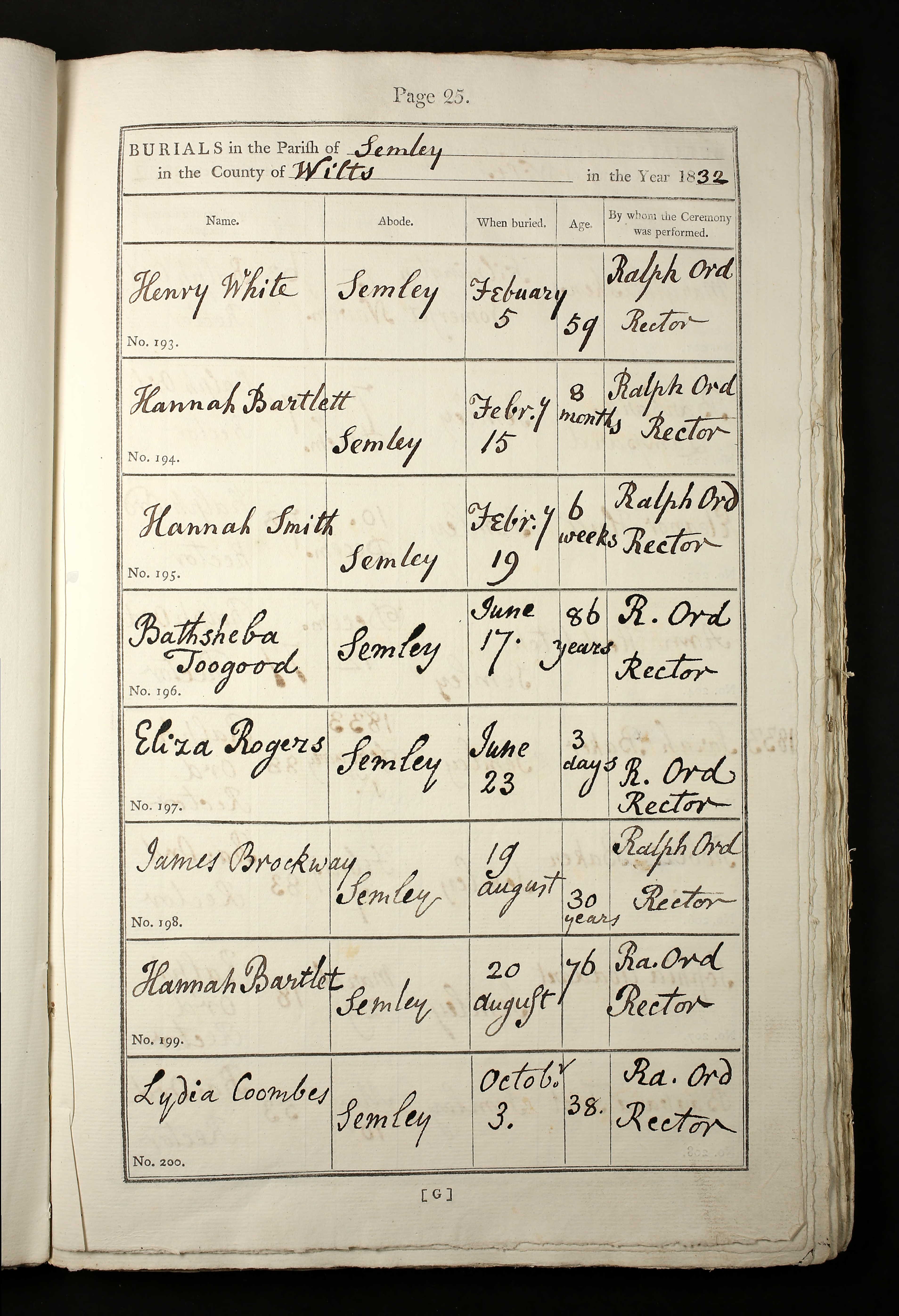 • Burial Image: Parish Record, 1832, Semley Church, Semley, Wiltshire, England. Bathsheba married William Toogood, son of William Toogood and Agnes Roper, on 28 Nov 1768 in Semley Church, Semley, Wiltshire, England.1 (William Toogood was born in 1744 in Dorset, England, baptized on 7 Dec 1744 in Gillingham, Dorset, England, died in 1800 and was buried on 24 Sep 1800 in Semley Church, Semley, Wiltshire, England 3.) |