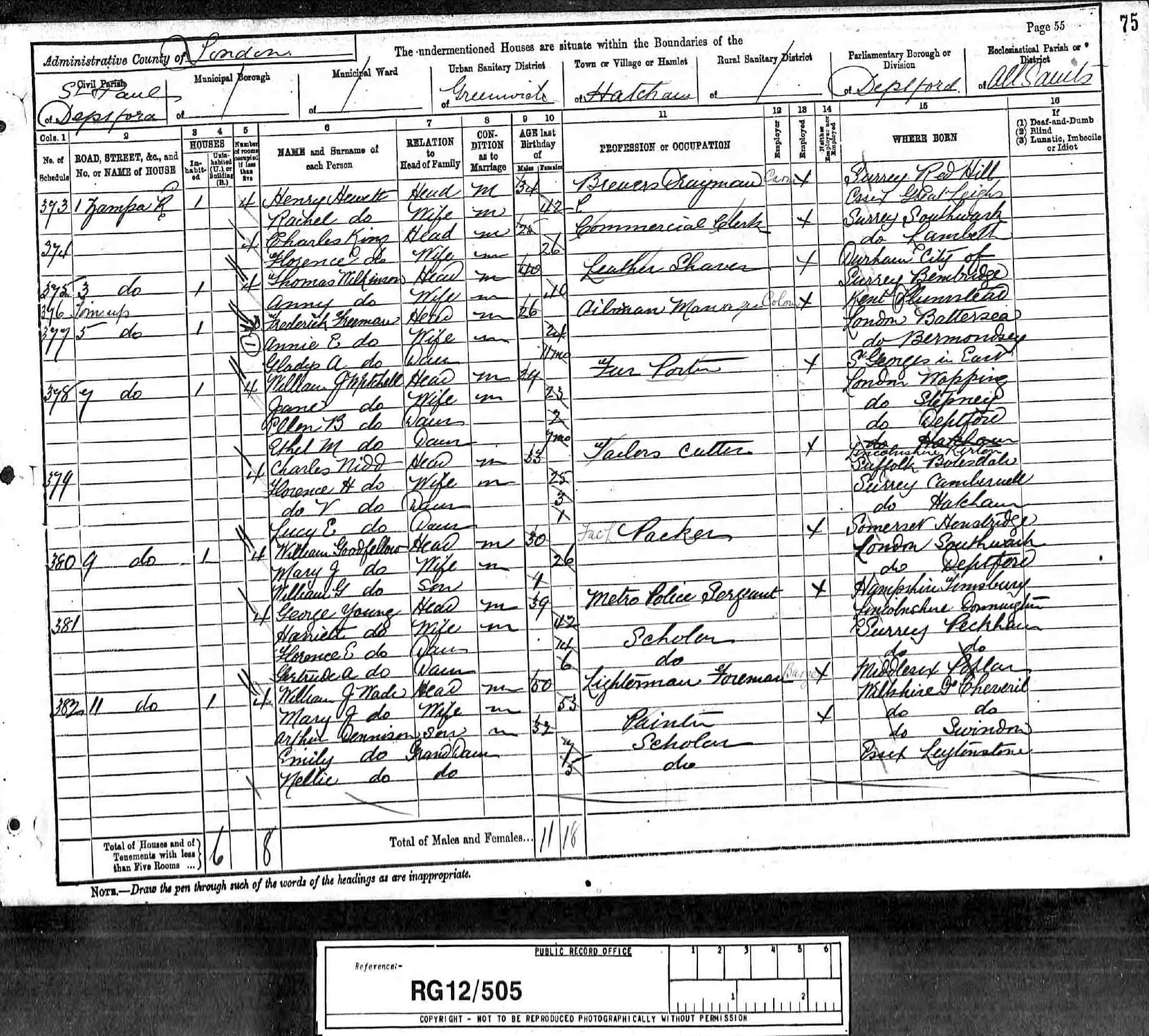 (1891 English and Welsh Census(London, TNA/Ancestry.co.uk, 1992) , Web site showing copies of original enumerator schedules) ID: CEN 1891 RG12, CEN 1891 rg12 505 75 55. Cit. Date: 22 Oct 2005. Cit. ID: CEN 1891 rg12 505 75 55. Surety: 3.